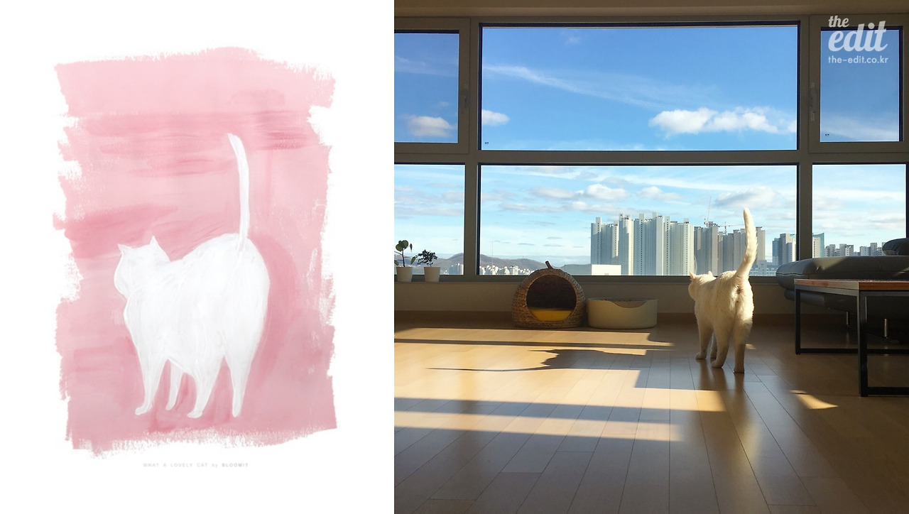 이제부터 소개할 그림들은 5만 원 미만의 ‘소확행’ 그림들이다. 거실 창문 사진과 함께 집에서 가장 자주 등장하는 그림으로 역시나 고양이다. 이 거실 그림은 반대로 작가가 우리집 고양이에게 영감을 얻어 탄생됐다. 인스타그램에 올린 사진을 보고 작가가 직접 <WHAT A LOVELY CAT>이라는 제목을 지어 선물했다. 아트 포스터와 일러스트 전문 그림 업체인 ‘예라스튜디오’에서 직접 제작한 아트 포스터로 현재도 판매 중이다. A3 사이즈 기준 3만 5,000원선.