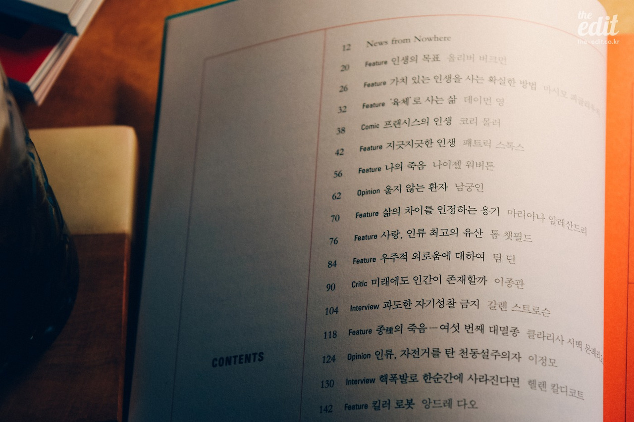 ‘과도한 자기 성찰 금지’, ‘종신형의 사회적 성과’, ‘더 중요한 목숨?’, ‘인생의 목표’ 등 제목만 봐도 읽고 싶게 만드는 글들이 많았다. 이 잡지 역시 위에서 말한 <채널예스>처럼 칼럼의 비중이 높다. 아니, 대부분이다. 이 잡지는 호주에서 처음 만들어졌기 때문에, 필자 역시 글로벌하다. 한국 필자도 있지만 70% 이상이 외국의 작가, 철학가, 철학과 교수, 언론인들이다.