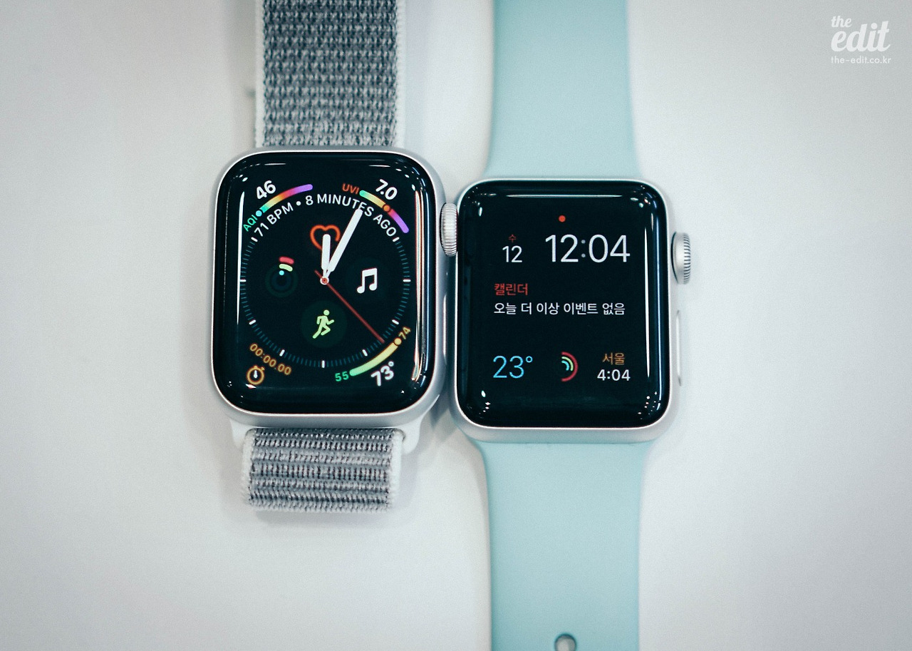물론 이 밖에도 애플워치 시리즈4의 변화는 많습니다. 케이스 크기를 최소화 하면서 디스플레이 면적을 30% 이상 키웠죠. 덕분에 베젤은 좁아지고 손목 위의 화면의 더 시원스러워졌습니다. 화면이 커진 것에 비해 실제 케이스 크기 변화는 크지 않습니다. 38mm가 40mm 정도로 늘어났어요. 실감이 날 만큼 큰 차이는 아니지만 첫 인상에서 주는 디자인 느낌이 변한 건 사실입니다. 전 개인적으로 본래의 아담한 38mm가 더 예뻐 보이네요.