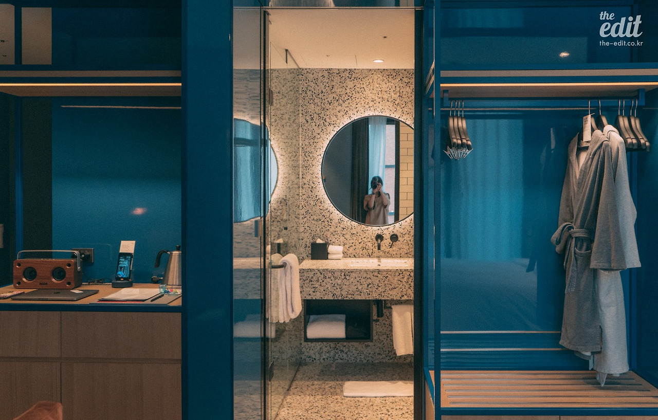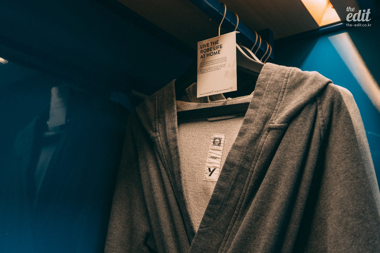 객실에 비치된 로브는 글래드 호텔의 것과 비슷한 디자인이었다. 까끌까끌할 것 같아서 입지 않으려 했는데, 만져보니 아주 부드럽다. 후디를 가운으로 만든 것 같은 편안함이다. 요즘 뜨고 있는 국내 브랜드 ‘이세(IISE)’와의 협업으로 만든 제품이더라. 이세는 한옥 창틀의 격자무늬 같은 한국적인 요소에서 영감을 받아 스트리트 패션으로 풀어낸 멋진 브랜드다. 이 작은 방 여기저기에 풍부한 스토리가 숨어있는 것 같아서 호기심이 동한다.