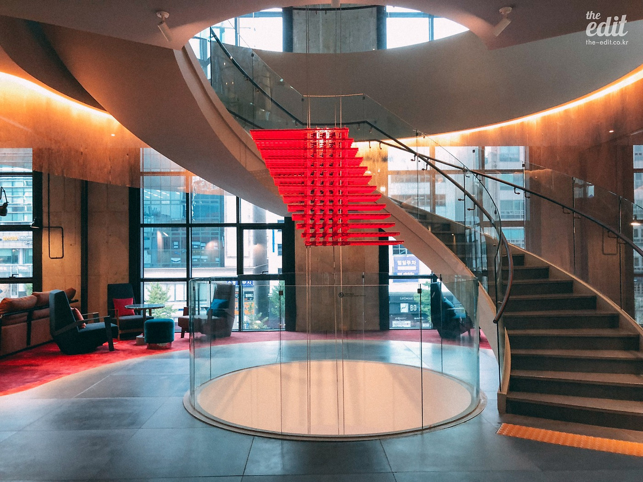 빨간 철근으로 만든 조형물은 권경환 작가의 작품이다. 럭셔리한 화려함은 아니지만 라이즈에 잘 어울린다. 호텔 곳곳에 작가의 기하학적인 작품이 걸려있는데 각도에 따라 마치 샹들리에처럼 보여서 재밌다.
