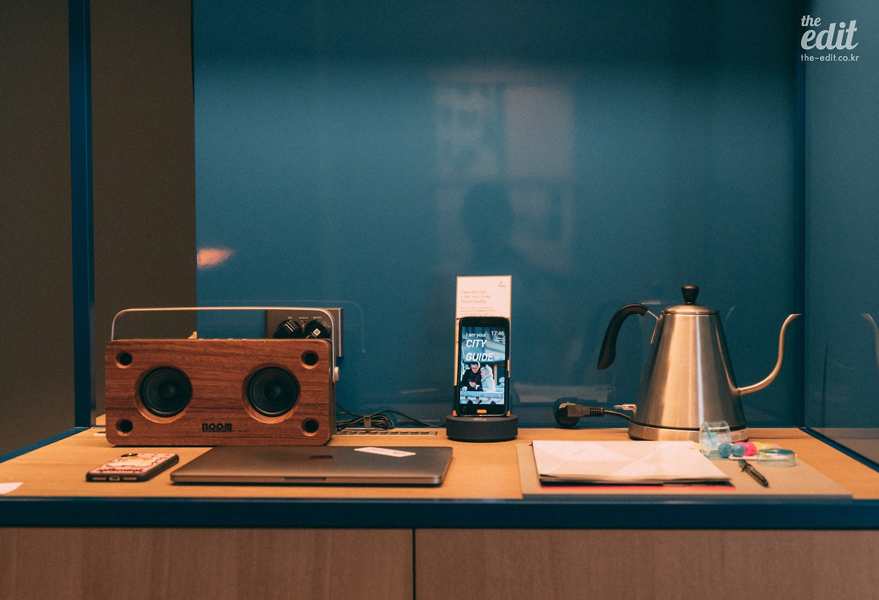객실에 비치된 아이템도 전반적으로 영(young)하다. 고가의 스피커 대신 붐마스터 스피커가 자리하고 있다. 원목 소재의 아이템이라 전반적인 인테리어와 잘 어울린다. 들어보진 않았다. 내 맥북 스피커가 더 좋을 것 같아서.