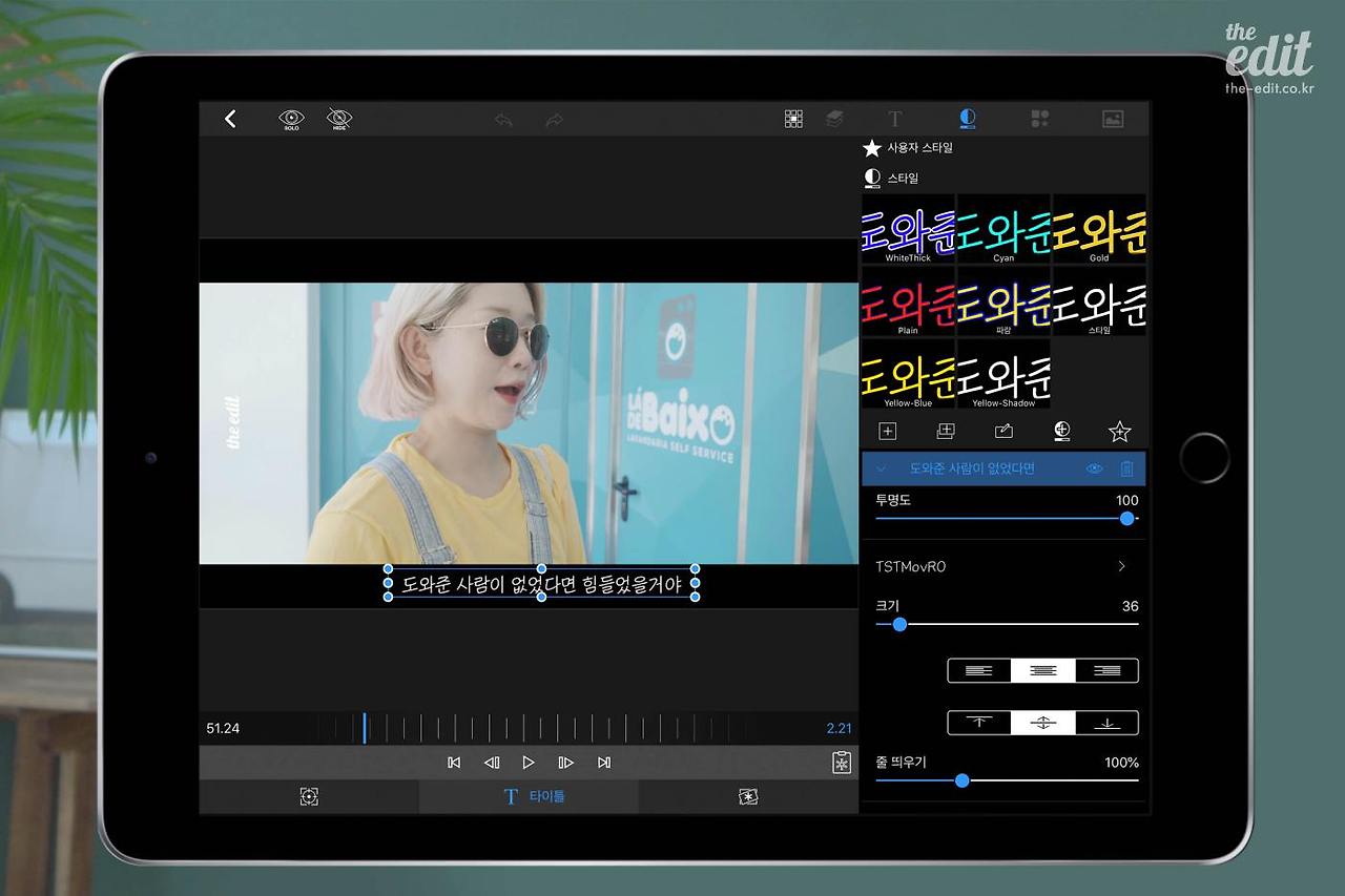 마찬가지로 자막 폰트 또한 외부에서 가져올 수 있다. 폰트 다운로드 후 적용하면 끝! 폰트 없다고 울상일 필요가 없다. 자막까지 트렌지션을 적용할 수 있고 자막에 이미지도 삽입할 수 있다.