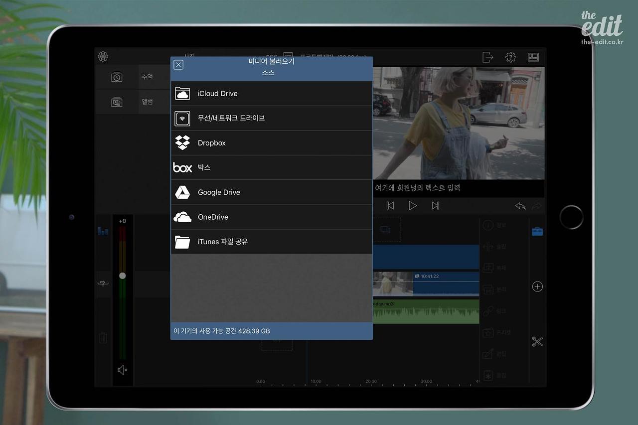 ‘예쁜’ 영상 만들기에 관심이 많아 보정과 자막에 신경을 많이 쓰는 편인데, 루마퓨전은 이런 내 욕망을 실현해줄 수 있는 앱이다. 아이클라우드, 드롭박스, 구글 드라이브 등의 클라우드 서비스를 이용해 외부 파일을 들여올 수 있다. 루마퓨전을 추천하는 가장 큰 이유가 바로 여기에 있다. 외부 파일을 들여올 수 있다는 건 내가 좋아하는 색감과 폰트, 음악을 전부 가져다 쓸 수 있다는 소리다. 정말이지 최고.