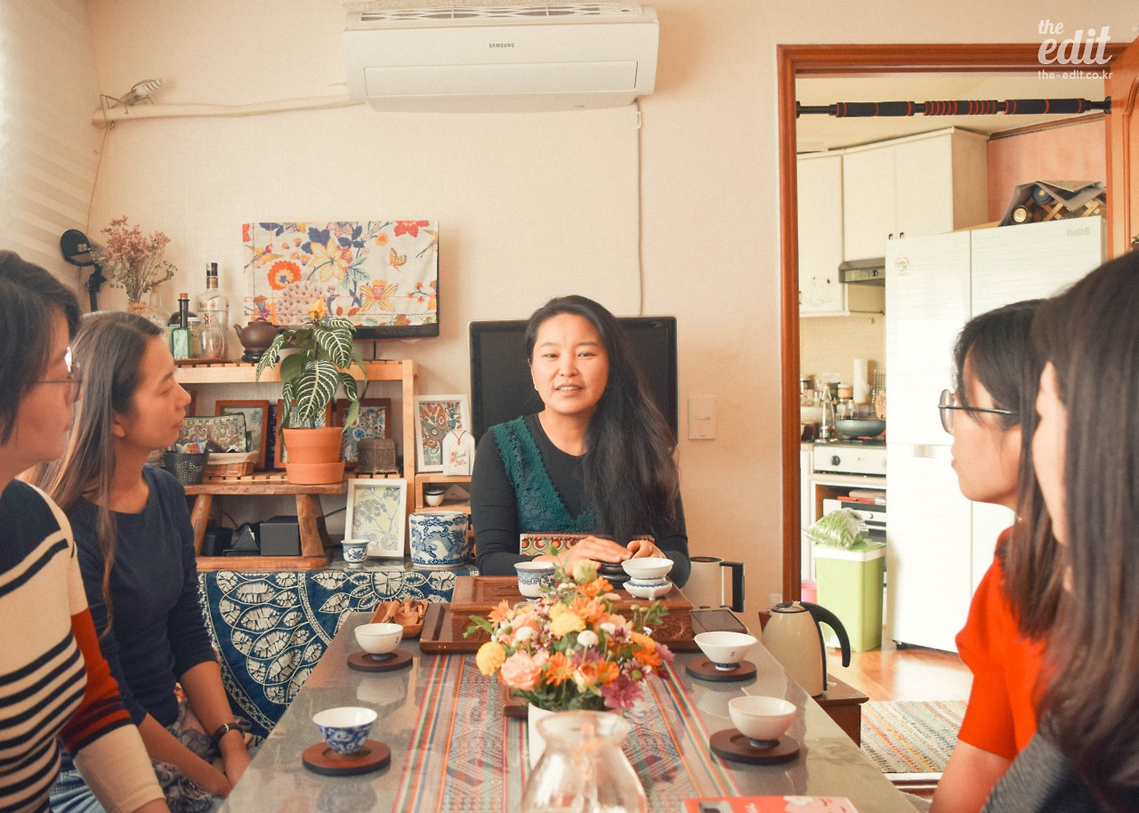 파스타를 닮은 요리 그리고 렌틸콩으로 만든 음식들이 한 상 가득차려졌다. 이름은 몰라도 호스트의 취향이 듬뿍 담긴 요리들이었다. 과연 세계곳곳을 여행한 작가다운 메뉴였다. 낮에 있었던 보이차 시간 때는 대화의 주제가 보이차에 관한 궁금증뿐이었는데, 저녁에 이어진 소셜다이닝에는 지금 내가 살고 있는 인생에 대한 이야기가 자연스레 흘러나왔다. 정년퇴직한 교사의 행복한 삶, 매일 밤을 새우는 직장인의 고된 삶. 처음 보는 사람들끼리 음식을 나누며 인생을 논했다. 물론 술도 빠지지 않았고. 어색할 것만 같았던 그 모임은 시간이 지날수록 따뜻하게 느껴졌다. 대학교 1학년 때 교양수업 조별모임을 하는 기분이었다.