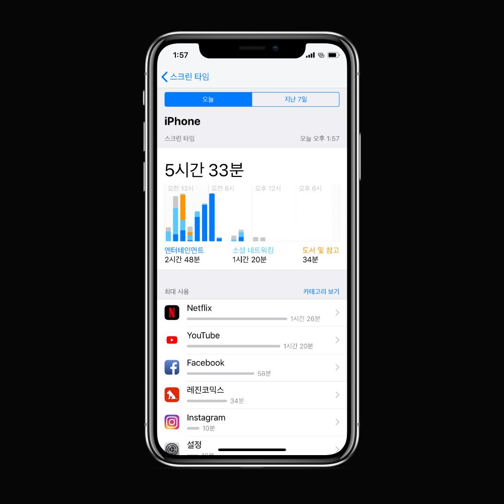 이 사실을 정확하게 깨달은 계기는 애플의 모바일 운영체제 iOS12에 추가된 스크린타임 기능이었다. 이름처럼 사용자가 화면을 활성화해둔 시간을 기록해주는 기능이다. 제일 처음 받아본 성적표(?)는 충격 그 자체였다. 겨우 오후 2시. 자정부터 카운트해서 14시간 밖에 지나지 않았건만, 내가 아이폰을 들여다본 시간은 5시간 33분이었다. 넷플릭스 1시간 26분, 유튜브 1시간 20분, 페이스북 58분, 레진 코믹스, 인스타그램… 밤새 잠을 참아가며 폰을 뒤적대고 다닌 결과였다. 7일 치 평균 통계를 받아봤을 땐 더더욱 기가 막혔다. 페이스북을 그렇게 오래 했을 줄이야. 아무 의미도 없고 감동도 없는 피드를 그렇게 하염없이 들여다보고 있는 내 모습이 한심했다.