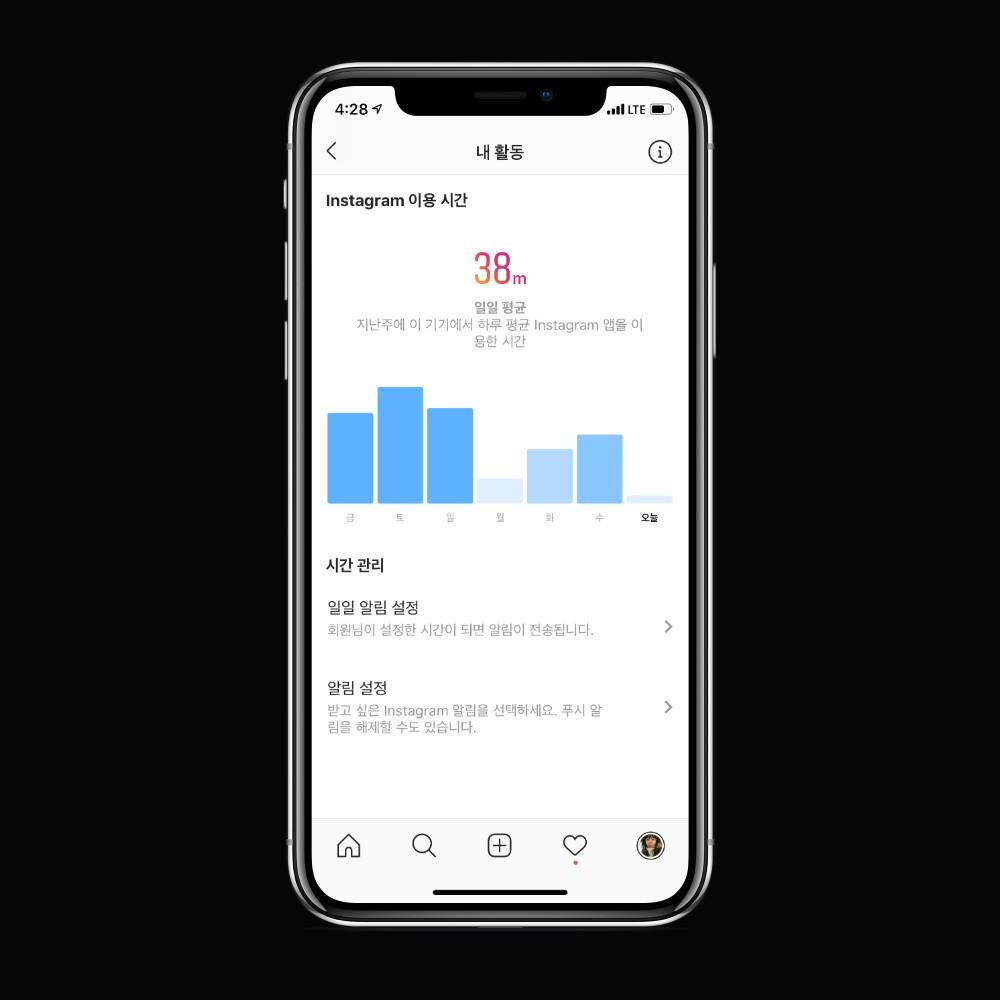 다들 잘 모르고 있지만 유튜브와 인스타그램 앱에도 비슷한 기능이 있다. 유튜브 설정에서 ‘시청 중단 시간 알림’을 활성화해두면, 내가 설정한 알림 빈도마다 잠깐 시청을 쉬어가자는 메시지가 표시된다. 인스타그램 역시 하루 평균 얼마나 앱을 이용하는지 그래프 형태로 보여주고, 설정한 시간마다 사용 시간에 대한 알림을 전송할 수 있게 했다.