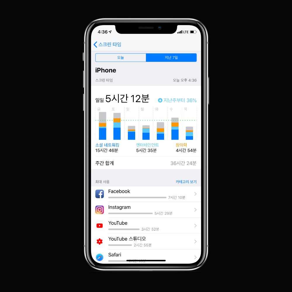 매일 밤 의식적으로 ‘오늘은 잠깐만 보고 자야지‘하며 다짐한다. 조금씩 줄여나가고 있다. 졸리면 자고, 더 이상 볼 것이 없으면 폰을 내려두는 습관을 가지려고 한다. 지난주보다 36%가량 줄었다는 내 스크린타임을 보니 약간 흐뭇해진다.