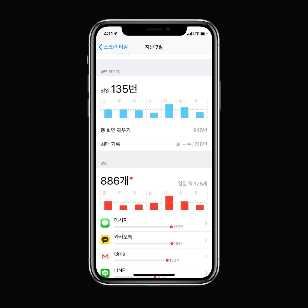 하루 평균 스마트폰 화면을 깨우는 횟수가 135번에 달했다. 알람은 하루에 126개씩 울린다. 끔찍한 숫자였다. 업무 시간엔 대부분 맥북을 사용한다는 걸 고려하면 상황은 더더욱 심각했다. 내가 디지털기기가 없이는 1분도 제대로 사고하지 못한다는 뜻 같았다.