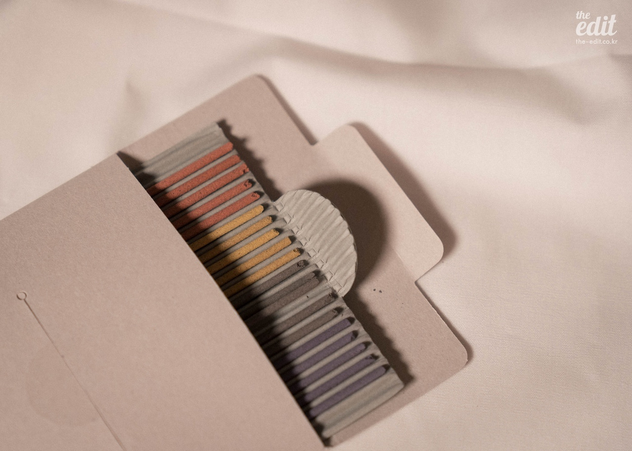 포장을 열면 쿠키 박스처럼 가지런한 스틱이 빼꼼 고개를 내민다. 빨간색의 백단나무, 노랑색의 귤피, 회색의 개암 그리고 보라색의 무화과 향이 딱 5개씩 20개가 들어있다. 가격은 7,000원. 조금씩 사용해보고 가장 마음에 드는 향을 박스로 살 계획이다. 책상 위에만 두어도 강한 향으로 존재감을 나타내는 인도의 인센스와 달리 오이뮤의 인센스는 가까이에 코를 가져다 대고 킁킁대며 맡아도 아주 은은한 향을 낼 뿐이다.