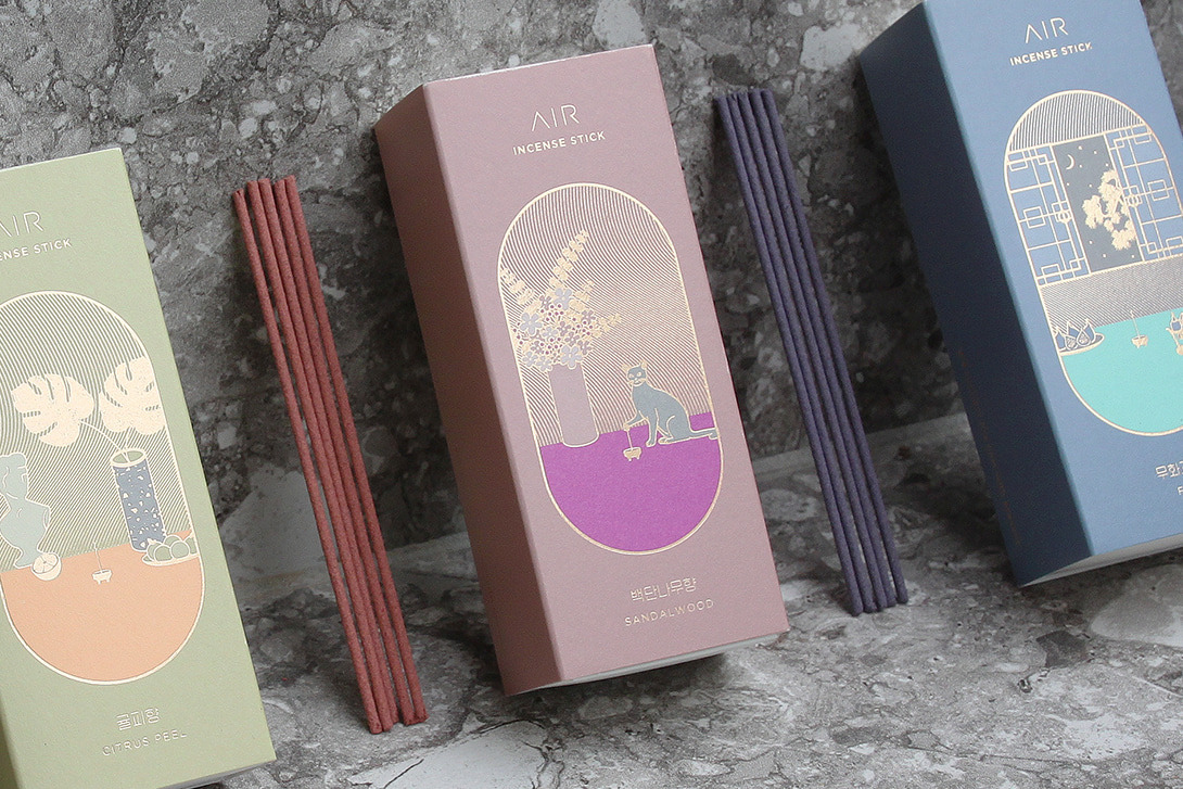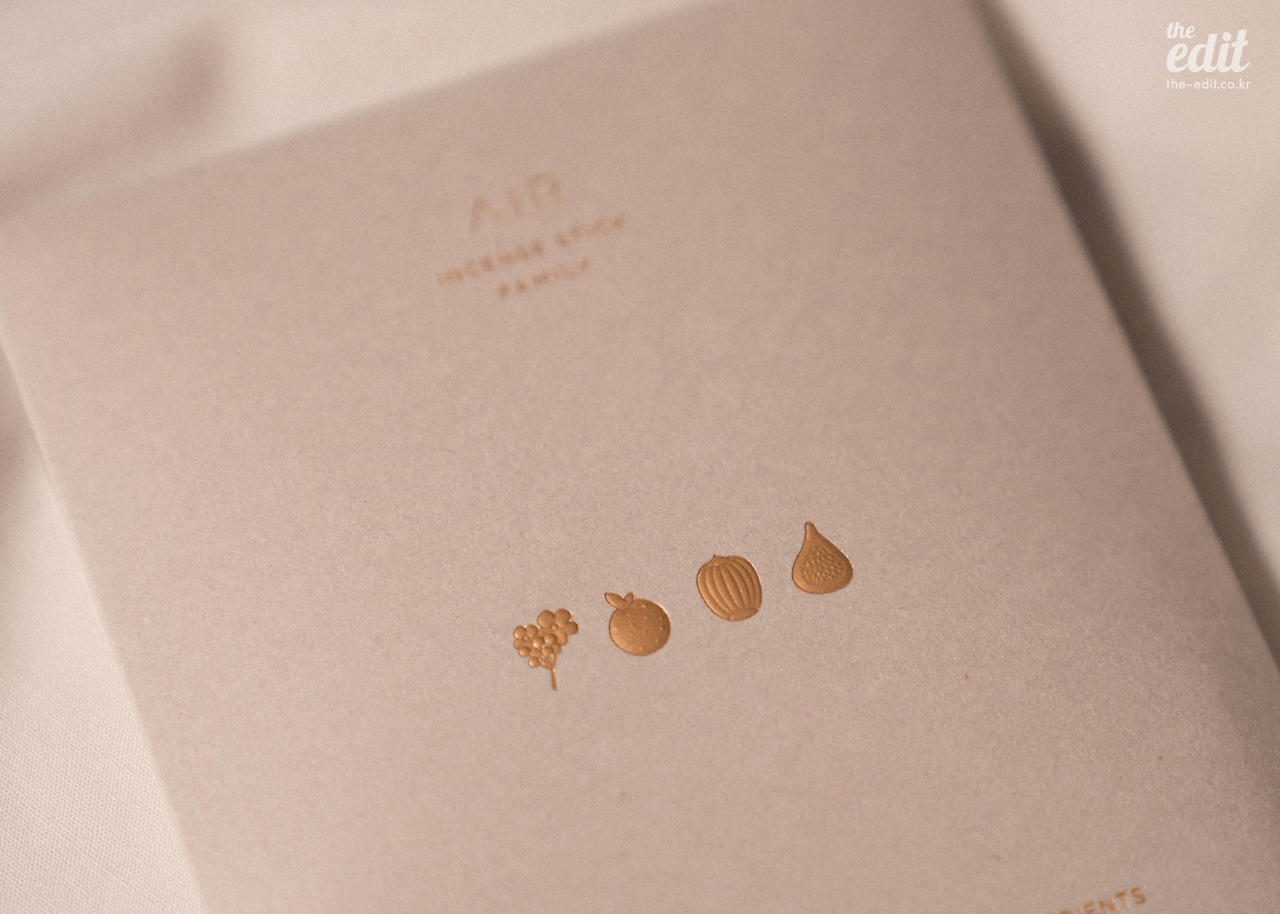 오늘 피울 오이뮤 ‘인센스 스틱 패밀리’는 이번 AIR 프로젝트의 모든 향을 5개씩 모아둔 일종의 샘플러다. 백단나무, 귤피, 개암 그리고 무화과가 금박으로 볼록 튀어나온 패키지가 어찌나 앙증맞던지.