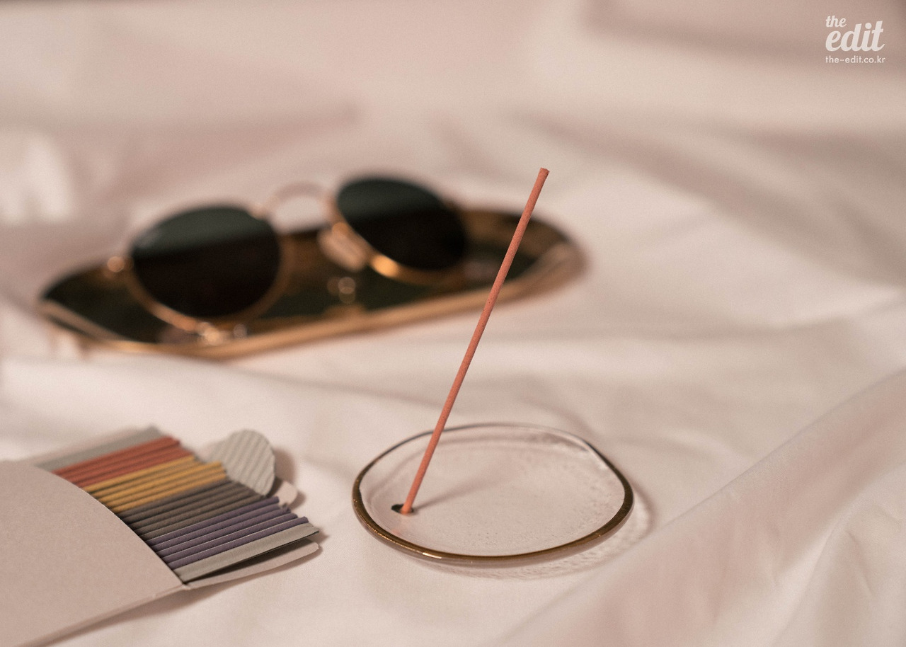 몽글거리며 투명하게 빛나는 홀더에 빨간 인센스 스틱을 꼽고 더 빨갛게 빛나는 불을 붙인다. 활활 타오르던 불은 이내 사그라들고 검고 빨간 불빛만이 반짝인다. 시간은 딱 15분. 춤추듯 흔들리는 연기는 아무리 봐도 질리지 않는다. 플레이트 위에 앉은 회색빛 재는 휴지통에 털어 둔다. 향을 피울 때보다 은은하게 나는 잔향이 더 향기롭다. 역시 쾌쾌한 향기를 잡는데는 인센스만한 것이 없다.