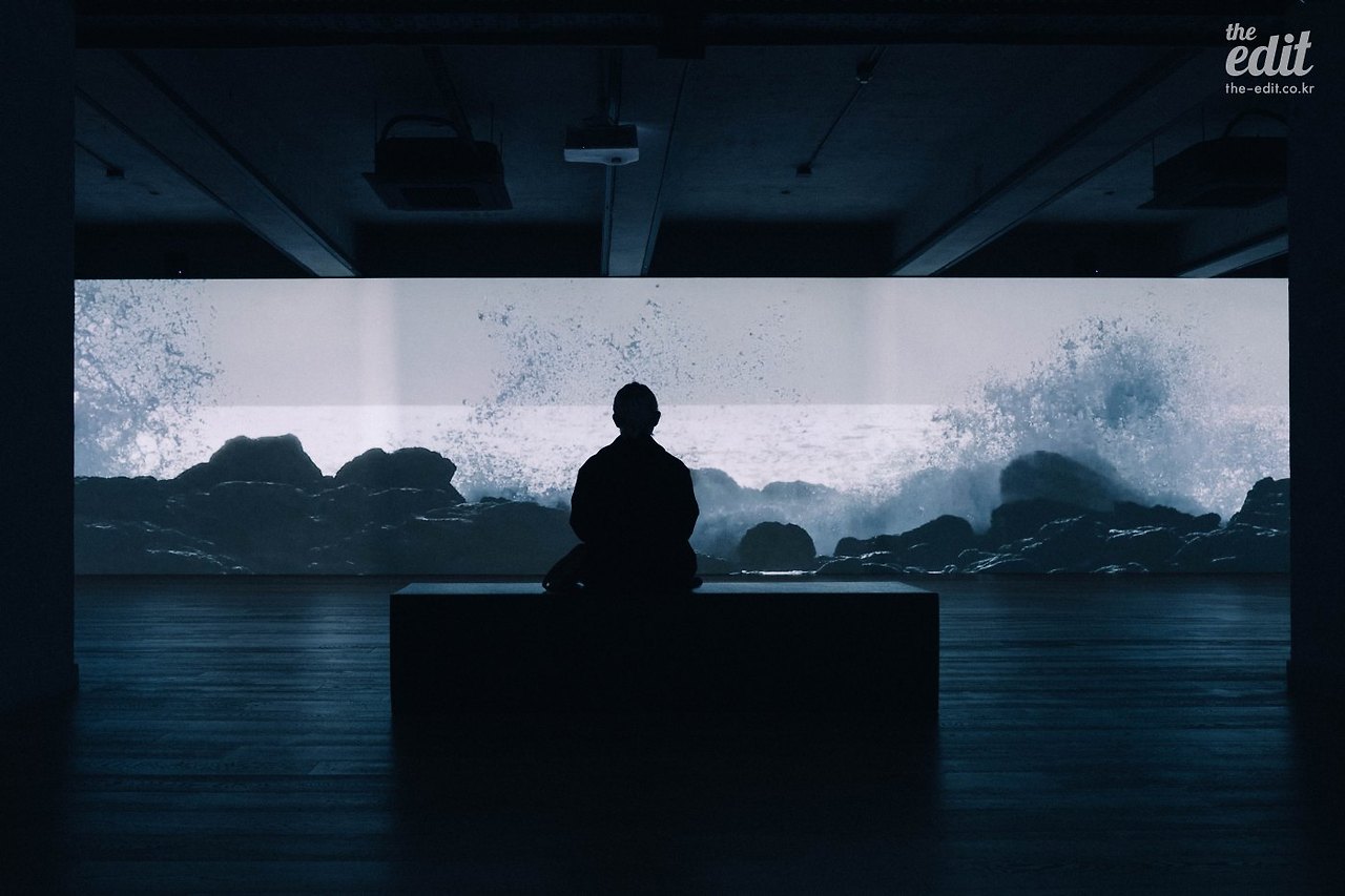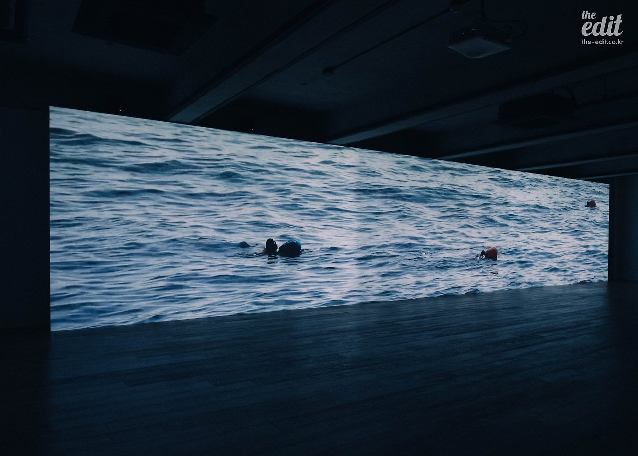 한쪽 벽면을 가득 차지하고 있는 가로 15m, 세로 3m의 압도적인 크기의 영상. 벽면엔 거세게 몰아치는 파도, 뜨고 지는 해, 하늘에서 내려다본 가파도의 모습이 압도하며 밀려든다.