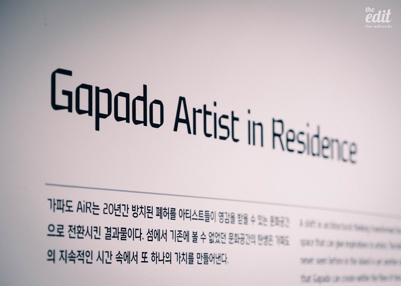 전시장을 들어서자마자 가장 먼저 가파도 AiR(Artist in Residence)에 대한 설명부터 눈에 들어온다.아티스트들이 잠시 머물며 작품 활동을 할 수 있도록 지원하는 공간이다. 이곳은 한 때 펜션을 만들기 위해 기초공사까지 했다가 어떤 사정으로 버려졌지만, 20년 만에 전혀 다른 모습으로 바뀌었다. 참고로 지을 뻔했던 펜션의 이름은 파랑새 펜션이었다고 한다. 이름처럼 멀리 달아나버린 줄 알았던 파랑새를 현대카드와 제주도 그리고 주민들이 함께 힘을 합쳐 다시 불러냈다.