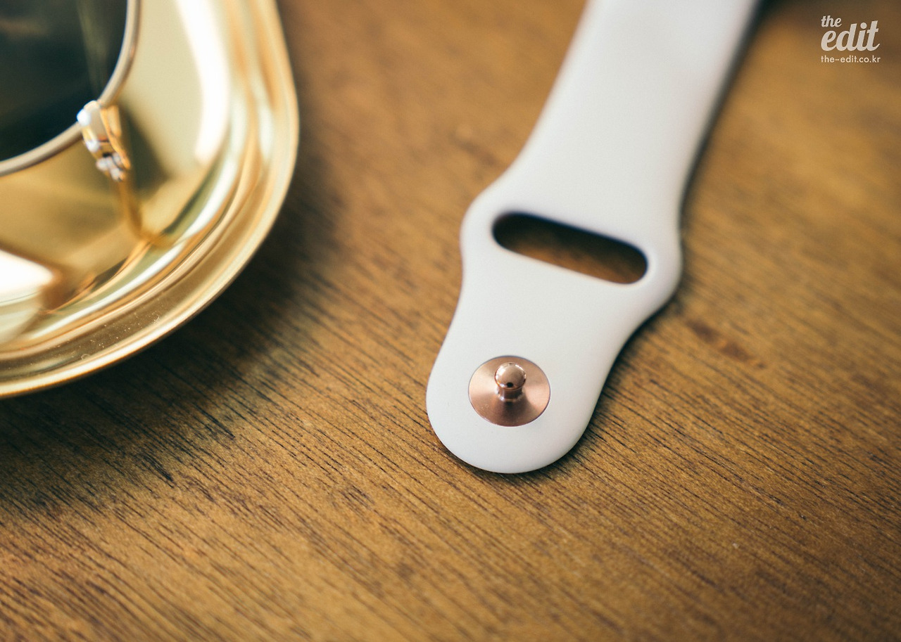 함께 매칭된 스톤 컬러의 스포츠 밴드. 금속 잠금장치 부분도 골드 케이스와 깔맞춤했다. 좋은 디테일이다. 새로운 골드 밀레니즈 루프를 매칭했으면 더욱 좋았을 것이다. 손목에서 부내가 폴폴 풍겼겠지. 하지만 나는 2019년에 도착할 에르메스를 지른 몸. 18만 5,000원을 추가 지출할 여유가 없었다. 후후.