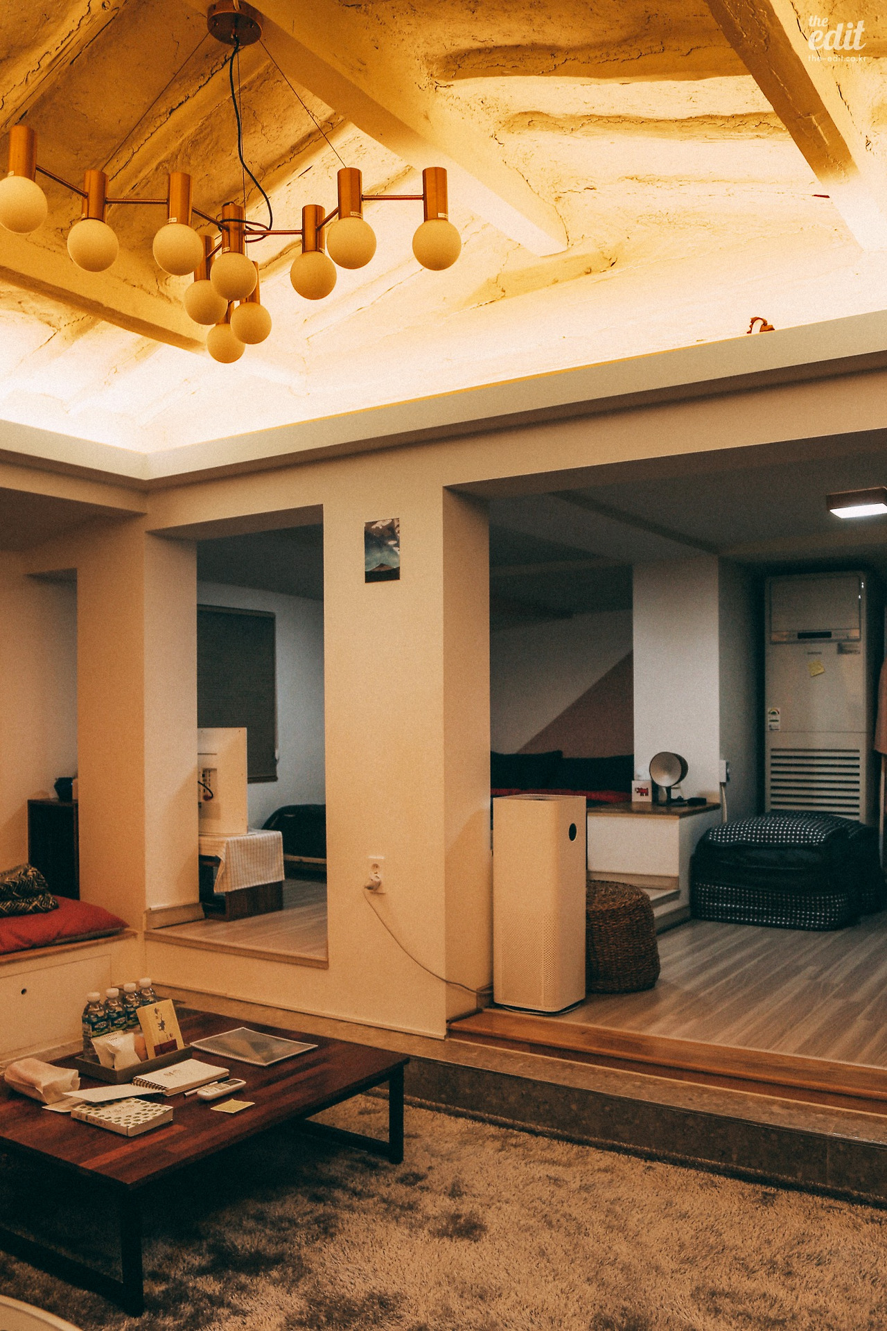 내부를 보자. 전통 가옥은 집안이 넓지 않다. 천장도 낮다. 그래서 벽을 다 없애고 원룸 형태로 만들었다. 천장도 뜯어내어 서까래가 드러나게 했다. 벽을 페인트로 다시 칠하고 마루만 다시 깔았다. 너무 밋밋하니 간접 조명으로 포인트를 줬다. 하지만 호텔처럼 세련된 공간은 아니다. 모든 것을 다 뜯어내는 게 아니라 살릴 것은 최대한 살리고 재활용했다. 버려진 집을 재생한다는 원래 취지에 맞는 리모델링이다.