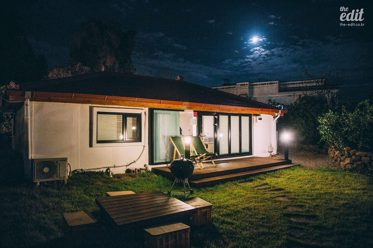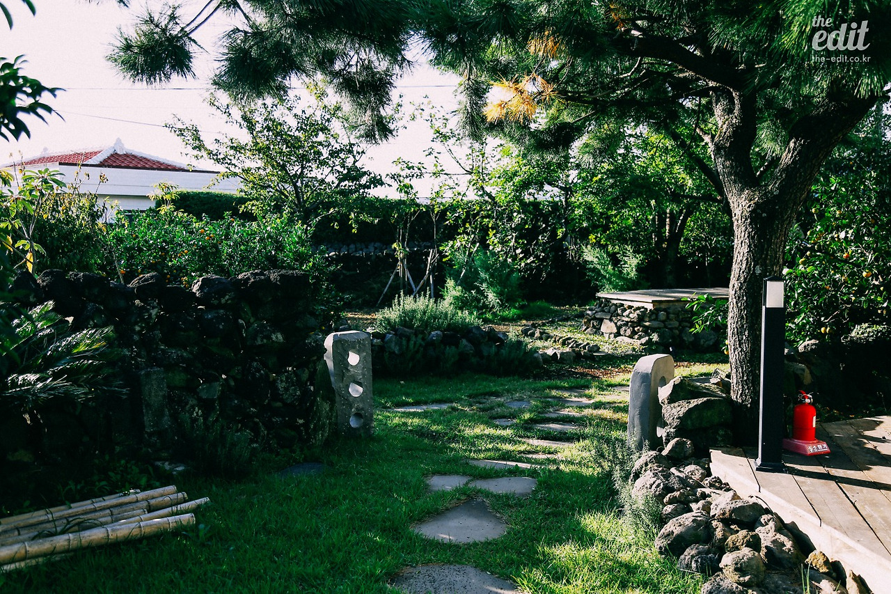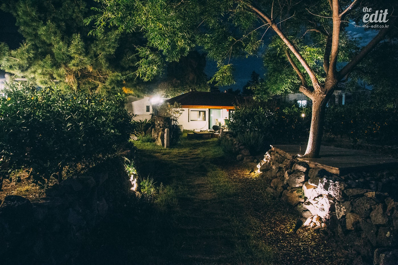 그래서 겉모습은 그저 제주도에 흔하디흔한 가옥이다. 전통적인 초가집도 아니고 돌집도 아니다. 슬래브지붕과 회벽으로 이뤄진 평범한 외양이다. 대신 내부가 덜 춥고 흙먼지도 없다. 외떨어진 숲 속도 아니다. 제주도의 따뜻한 남쪽(중문과 서귀포 사이) 평화로운 마을에 위치해 있다. 조용한 동네지만 주변에 집들이 많기 때문에 밤에도 쓸쓸하지 않고 안전하다. 마당이 꽤 넓어서 저녁에 바비큐를 해 먹어도 크게 주위에 폐를 끼치지 않는다.