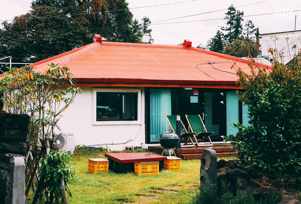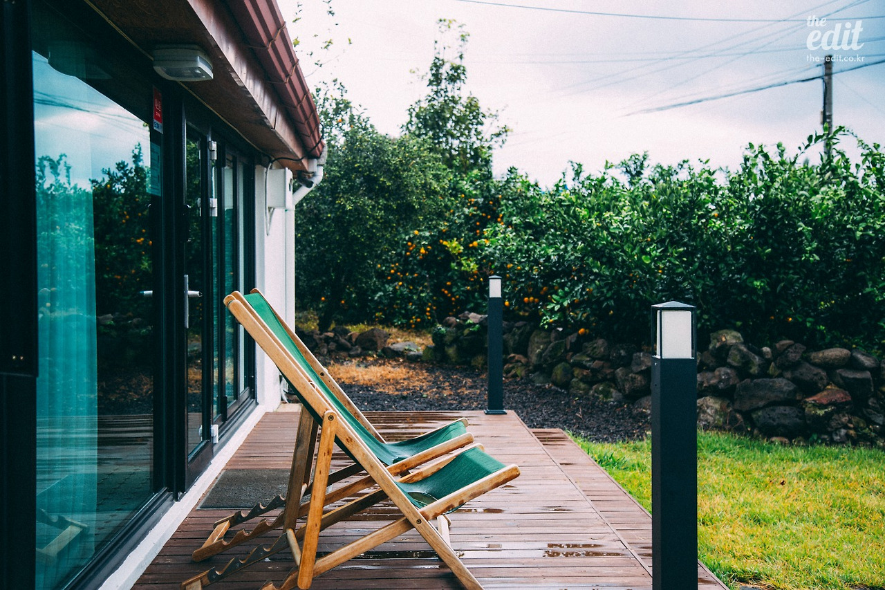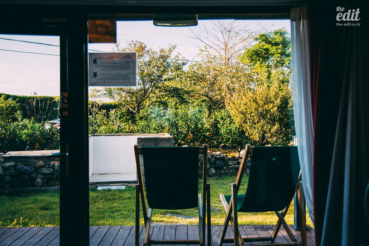 그래서 겉모습은 그저 제주도에 흔하디흔한 가옥이다. 전통적인 초가집도 아니고 돌집도 아니다. 슬래브지붕과 회벽으로 이뤄진 평범한 외양이다. 대신 내부가 덜 춥고 흙먼지도 없다. 외떨어진 숲 속도 아니다. 제주도의 따뜻한 남쪽(중문과 서귀포 사이) 평화로운 마을에 위치해 있다. 조용한 동네지만 주변에 집들이 많기 때문에 밤에도 쓸쓸하지 않고 안전하다. 마당이 꽤 넓어서 저녁에 바비큐를 해 먹어도 크게 주위에 폐를 끼치지 않는다.