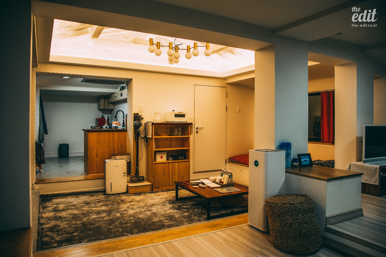 집안 중앙은 마룻바닥까지 뜯어내고 카펫을 깔았다. 가족이나 친구끼리 모여 밥도 먹고 대화도 할 수 있는 공간이다. 바닥이 주변보다 낮기 때문에 여기에 앉아 있으면 아늑한 느낌을 준다. 다만 부엌이나 침대로 들어가는 부분에 턱이 있어 불편함은 있다.