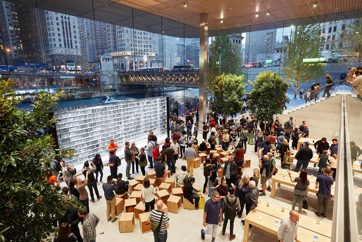 ‘애플 스토어’가 주는 경험은 각별하다. 단순히 내가 앱등이라 그런 건 아닐 것이다. 투명한 유리 큐브 안의 사과 로고와 빨려드는 듯한 나선형 유리 계단은 도시의 랜드마크 역할을 도맡는다. 애플 스토어의 두 가지 키워드는 ‘통일성’과 ‘변주’다. 해외 어떤 도시에 가도 똑같은 서비스, 똑같은 나무 테이블, 똑같은 제품. 눈이 마주치면 하이파이브를 청할 만큼 발랄한 스텝들의 접객 태도도 대부분 비슷하다. 하지만 공간을 풀어내는 방식만큼은 그 도시와 역사에 맡게 끊임없는 변주를 시도한다. 올해 만났던 애플 스토어 중 인상적이었던 곳은 단연 시카고 강변에 위치한 애플 미시건 애비뉴다. 시카고 강과 파이오니어 광장을 잇는 지점에 자리한 이 거대한 유리 건물은 모두의 시선을 사로잡는다. 투명한 건물 덕에 시야가 탁 트여 있는데다, 내부의 화강암 계단이 바깥의 광장으로 그대로 이어지는 구조라 안밖의 경계가 없는 것처럼 느껴진다. 건물 안에서 시카고 강을 바라보면 마치 물 위를 부유하는 것 같은 기분이 든다. 얇은 탄소 섬유 소재의 지붕을 사용했으며, 유리 전면을 가리지 않도록 내부에 있는 4개의 기둥만으로 건물 전체를 지탱하게 설계했다.