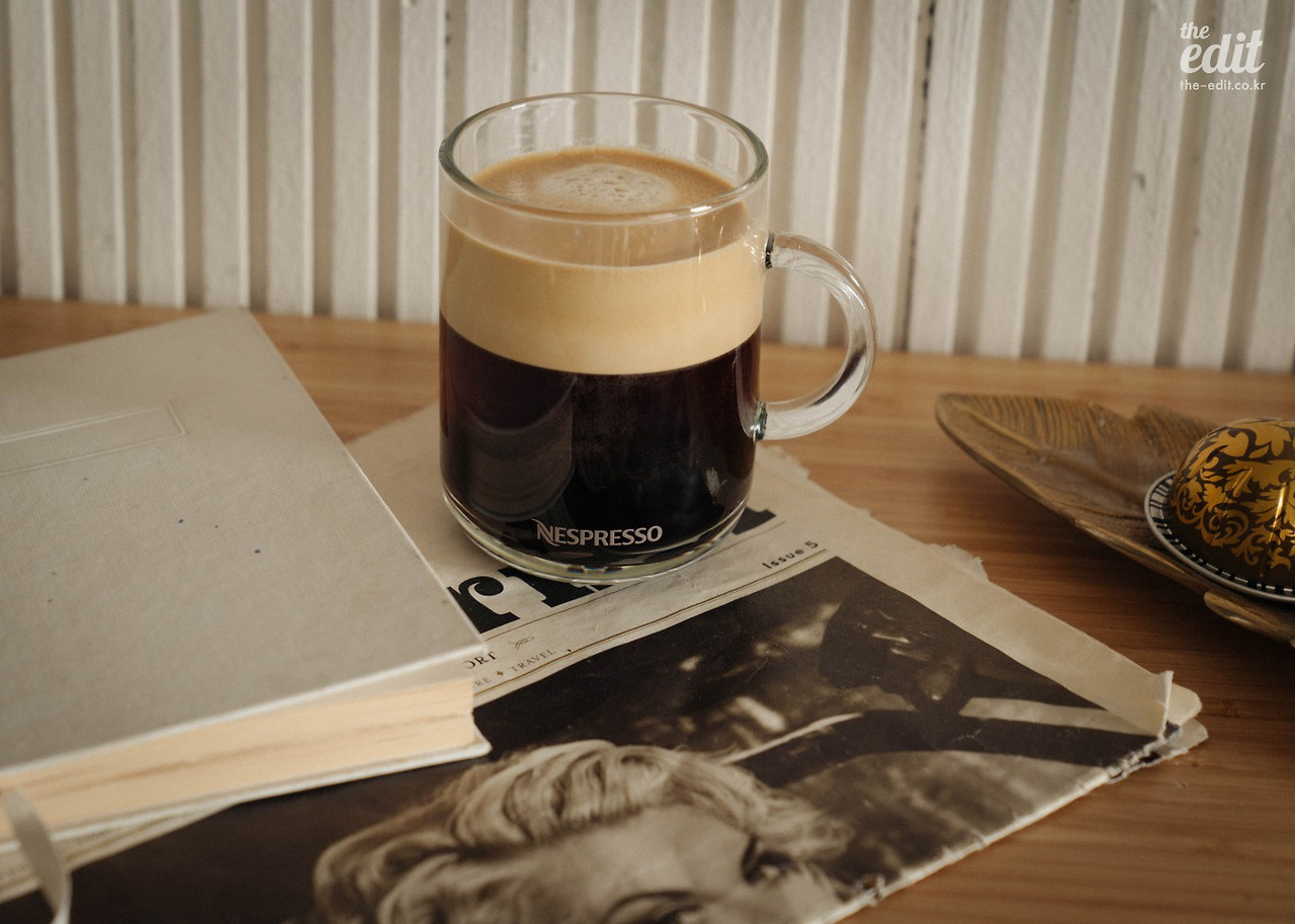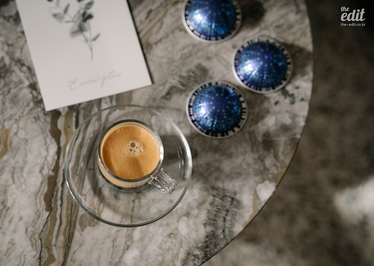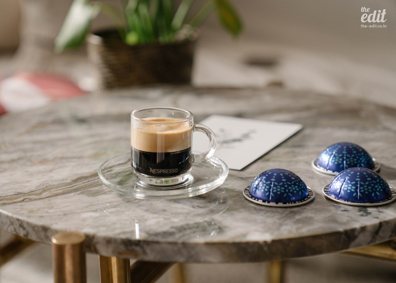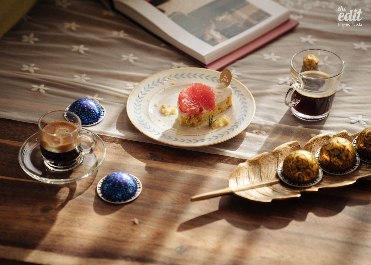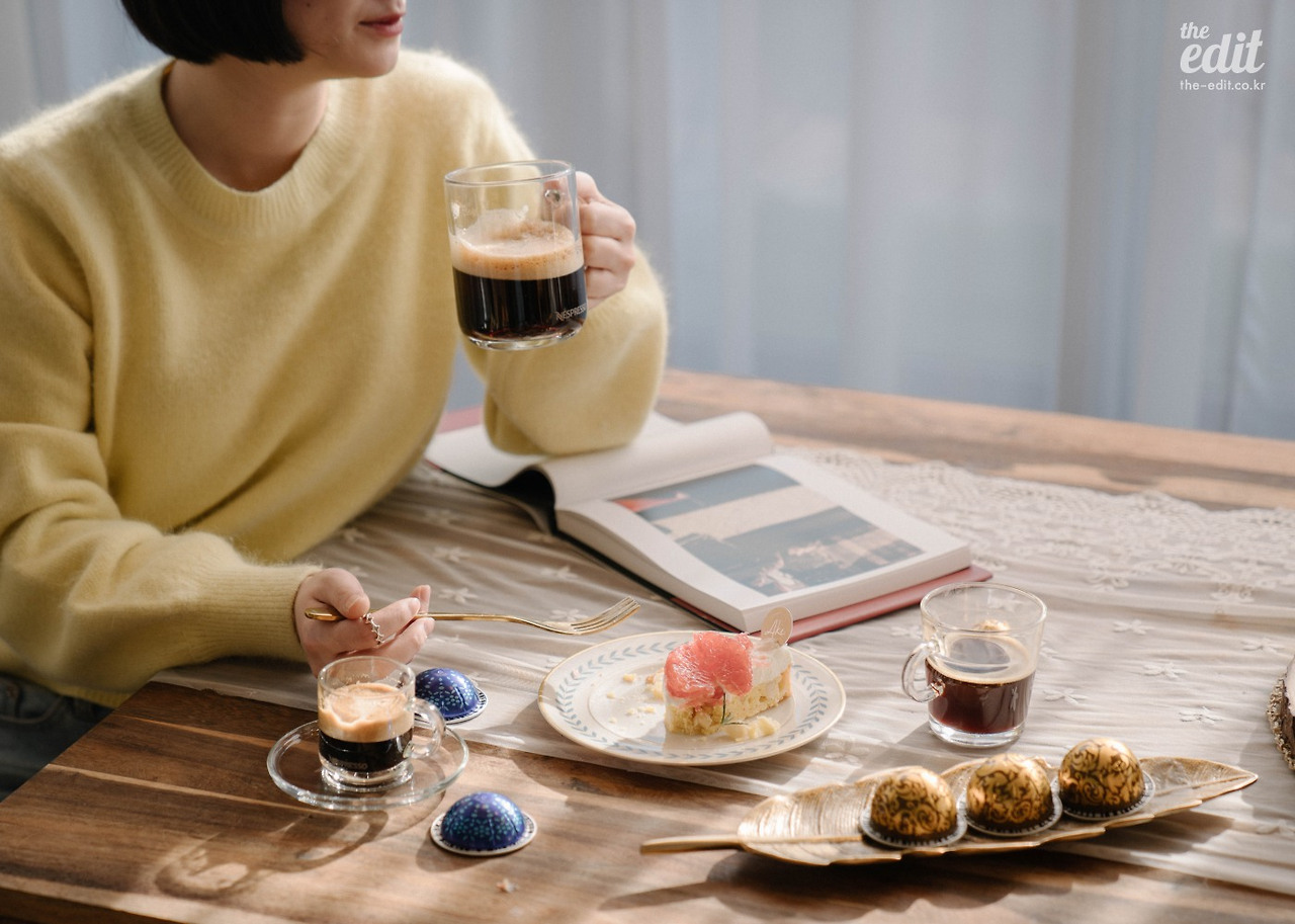 정신없이 셔터를 누르던 우리는 잠시 카메라를 내려 놓았다. 그리고 네스프레소가 그랬던 것처럼 과거 커피 하우스에 영감을 받아 커피를 두고 이런저런 이야기를 나눴다. 올 겨울 유난히도 해가 좋고 따듯한 날이었다. 시덥잖은 이야기였지만 바쁜 촬영 중 맛본 찰나의 행복이었다. 통창으로 햇살이 진격한다. “저 지금 행복지수가 엄청 높아요” 에디터 기은이 포크를 쥐고 함박 웃음을 지으며 말한다.
