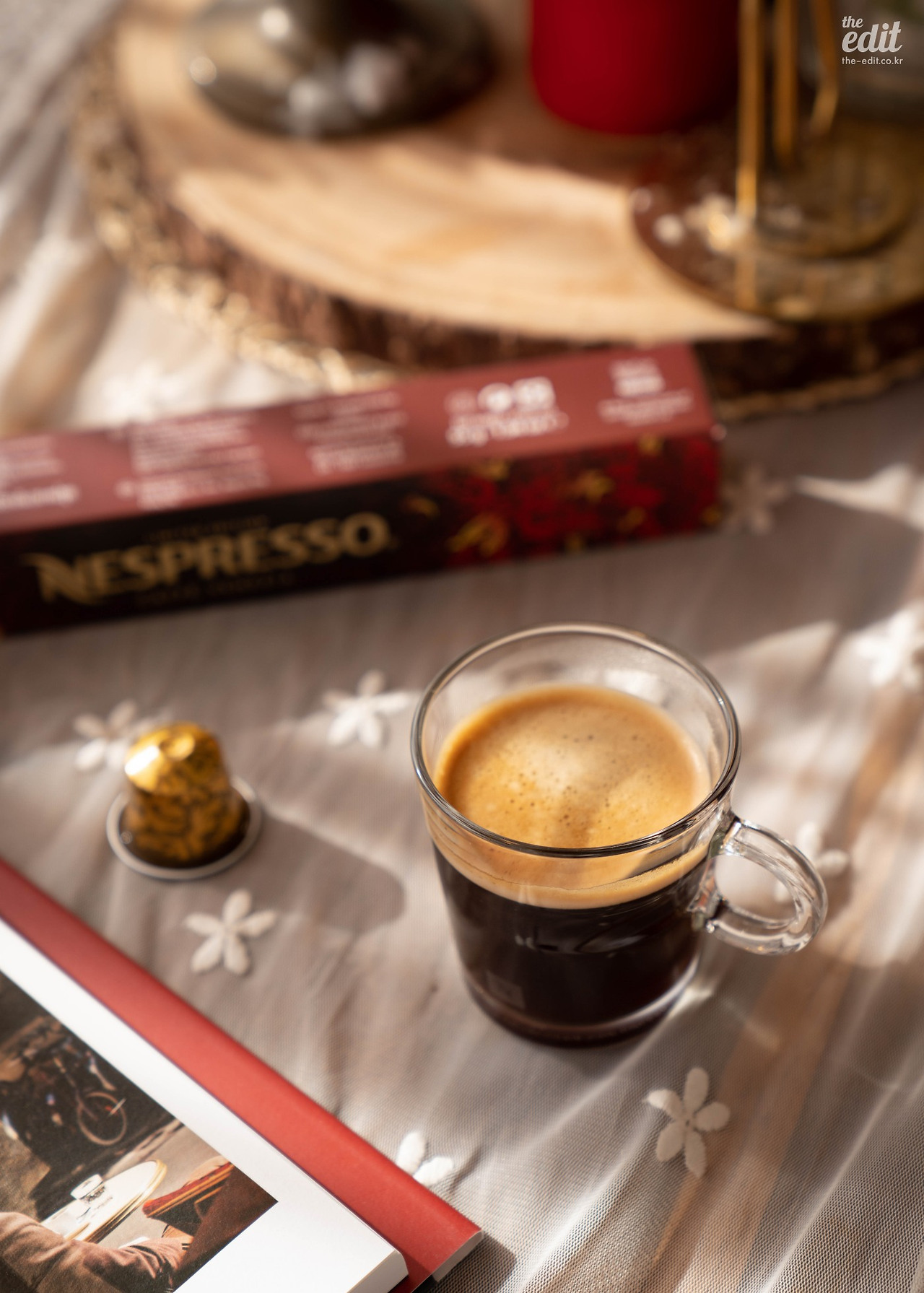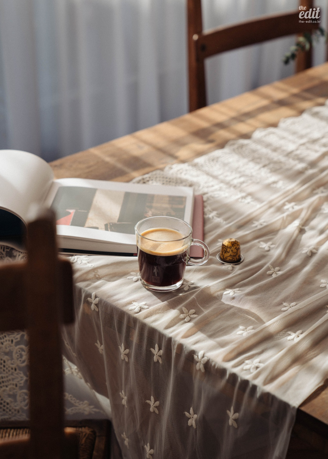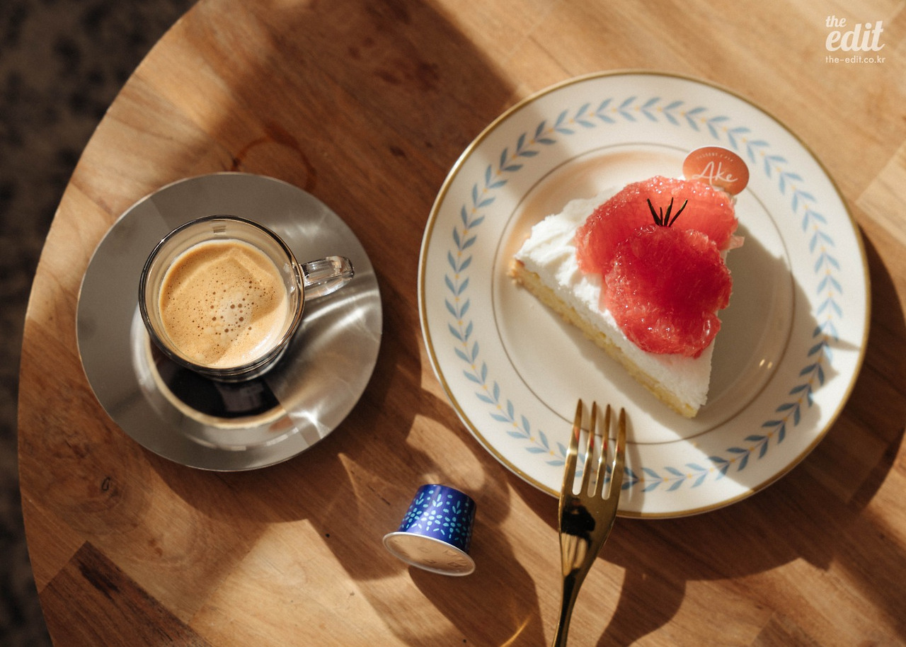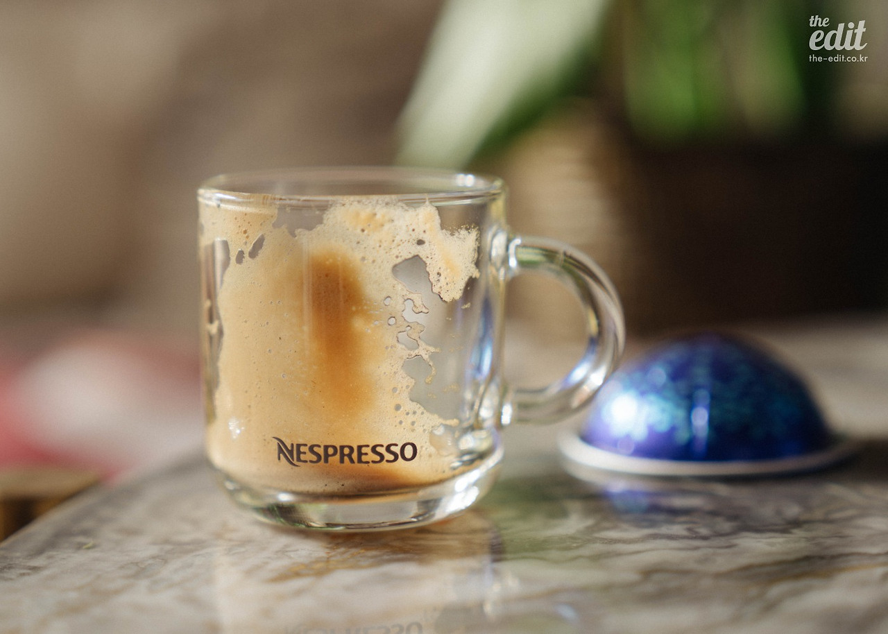 정신없이 셔터를 누르던 우리는 잠시 카메라를 내려 놓았다. 그리고 네스프레소가 그랬던 것처럼 과거 커피 하우스에 영감을 받아 커피를 두고 이런저런 이야기를 나눴다. 올 겨울 유난히도 해가 좋고 따듯한 날이었다. 시덥잖은 이야기였지만 바쁜 촬영 중 맛본 찰나의 행복이었다. 통창으로 햇살이 진격한다. “저 지금 행복지수가 엄청 높아요” 에디터 기은이 포크를 쥐고 함박 웃음을 지으며 말한다.