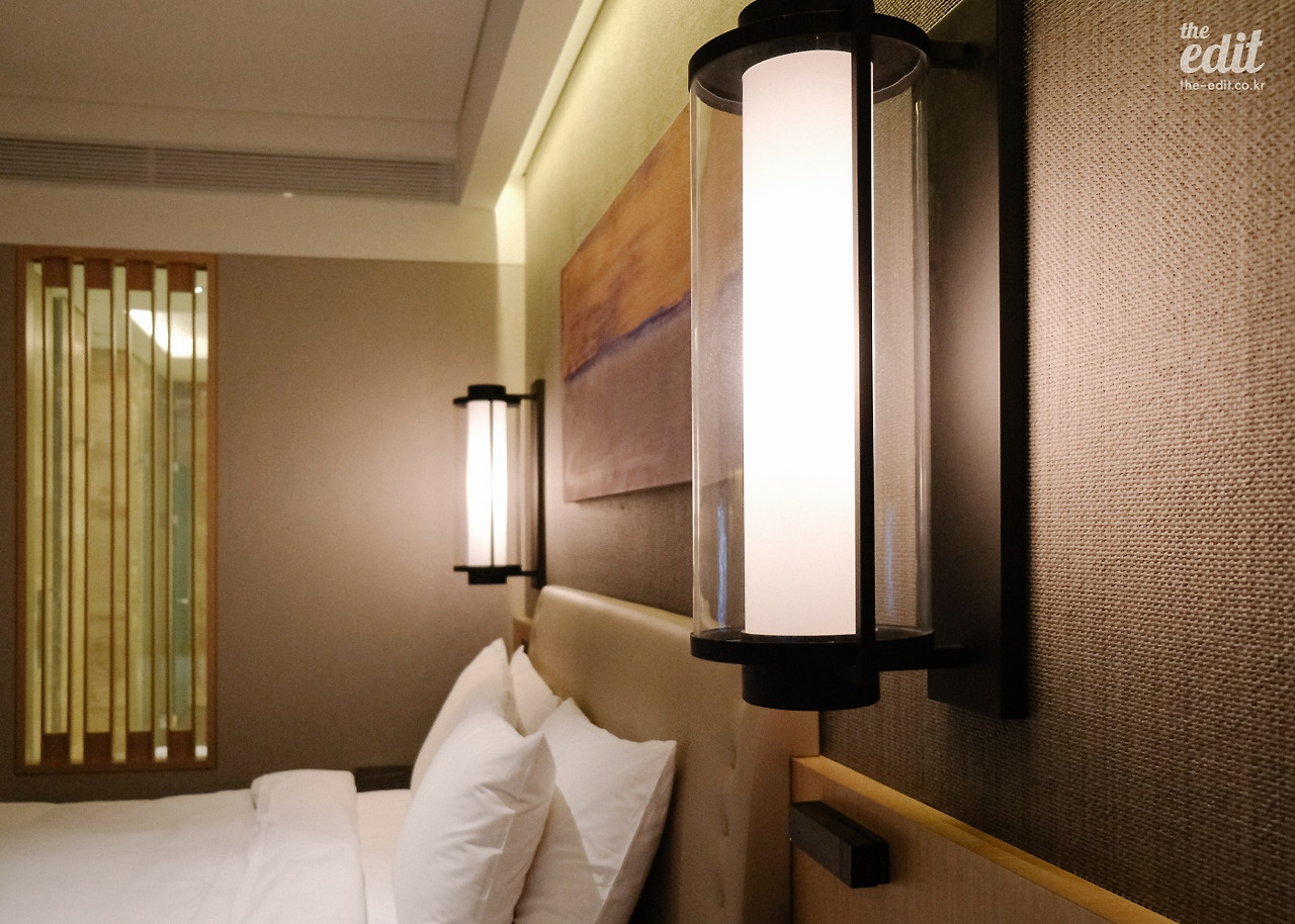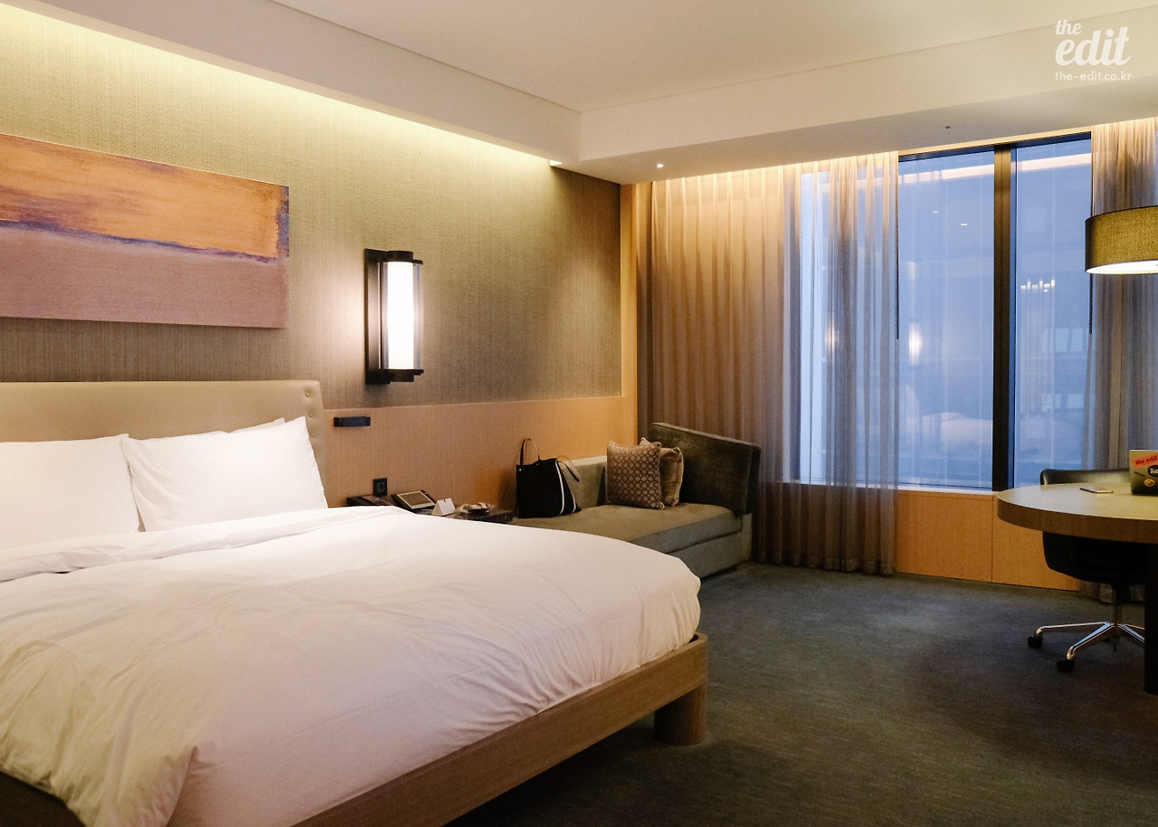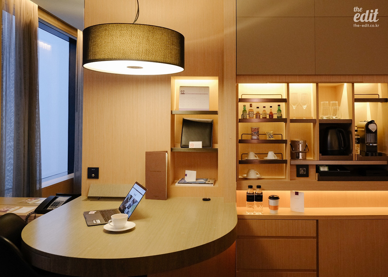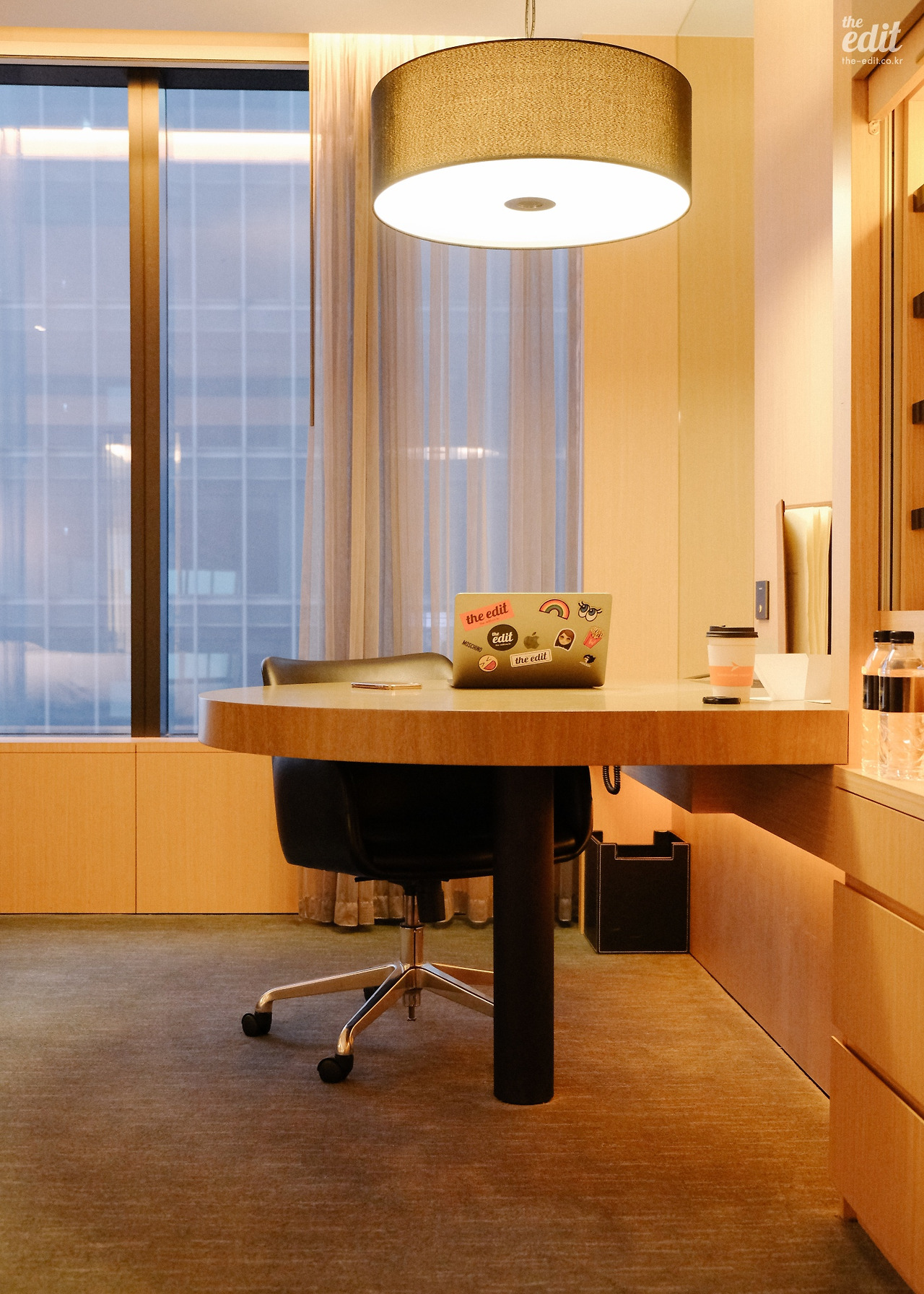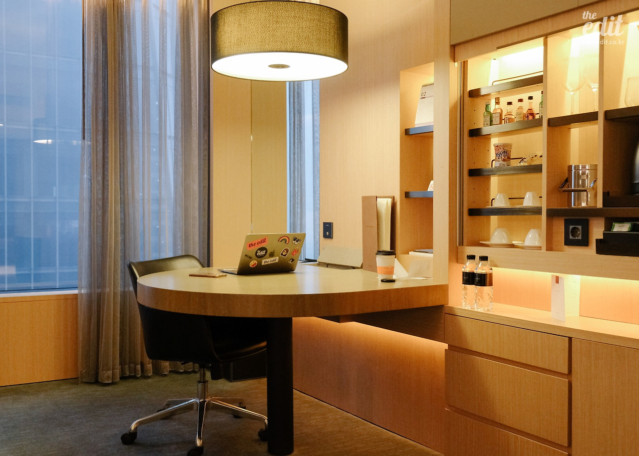 호텔 소개에 나와있는 것처럼 비즈니스와 여가에 모두 걸맞은 장소다. 앞에서 언급한 핑계(!)처럼 글을 쓰러 온 일정이었기 때문에, 창가에 위치한 큼직한 테이블이 반갑다. 보통 호텔의 디럭스 객실엔 벽을 마주보는 작은 책상이 있는데 여긴 오피스 데스크만큼 본격적인 크기다. 일하기 좋은 공간이었다. 반원형 테이블이라 객실 안쪽을 바라보며 앉아도 좋고, 의자를 옮겨 창문을 바라봐도 좋다.