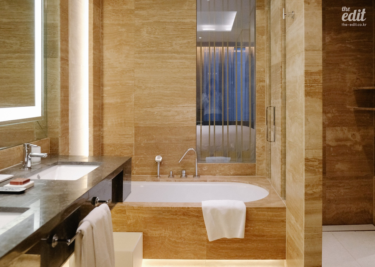 화장실도 넓은 편이다. 객실과 욕실이 유리로 뚫려있어 불편하다고 생각했는데, 세면대 옆의 버튼을 누르면 유리가 불투명한 형태로 변한다.