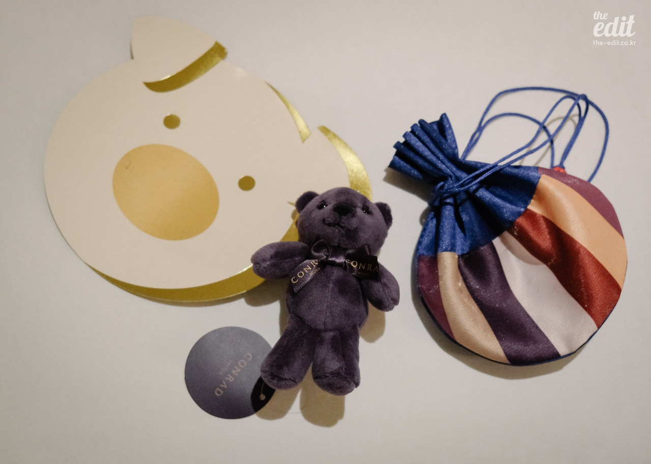 내가 예약했던 패키지에 포함된 행운 포춘백. 작은 콘래드 베어 인형과 경품권을 받았다. 돼지코를 긁었더니 배쓰 오일에 당첨되었더라. 아주 소소한 이벤트랄까.