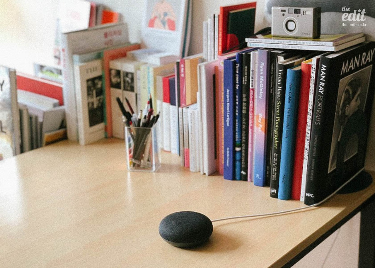 안녕, 여러분. 디에디트의 TMI 전문필자인 음악평론가 차우진이다. 오늘 주인공인 구글 홈 미니는 작년 말, 회사 송년 파티에서 경품으로 받은 스피커다. 이 스피커는 구글 어시스턴트로 구동된다. ‘음성 검색’ 기능이라고 부를 수도 있겠지만, 궁극적으로는 ‘대화 상대’로 설계된 프로그램이다. 구글 인공지능이 사용자의 행동 패턴을 이해하고 학습하도록 돕는 교육용 툴이자 사용자 편의성과 만족도를 높이기 위한 서비스라고 설명하면 되겠다. 구글이 직접 만든 하드웨어인, 인공지능 스피커 구글 홈과 연동된다. 내가 가지고 있는 건 구글 홈의 작은 버전인 구글 홈 미니다. (휴- 구구절절이지만)