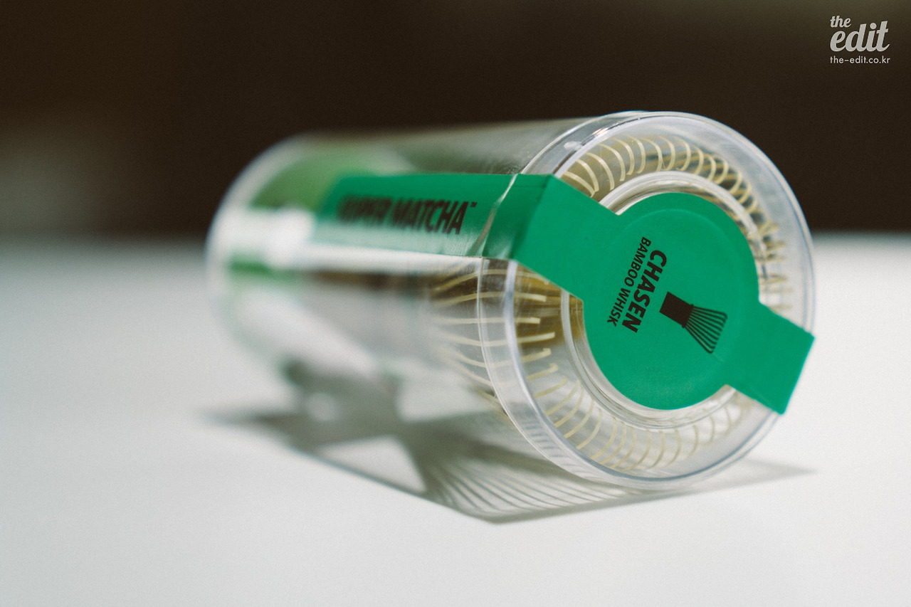 구성품부터 살펴보자. 100g의 슈퍼말차 오리지널 1캔. 까만 그릇은 국내 도예가와 만들었다는 전용 차완이다. 그리고 바로 문제의 그것. 귀하다는 국내산 오죽을 사용해 장인이 한 땀 한 땀 만든 차선 100본이 함께 들어있다. 차선은 말차를 섞을 때 쓰는 용도다.