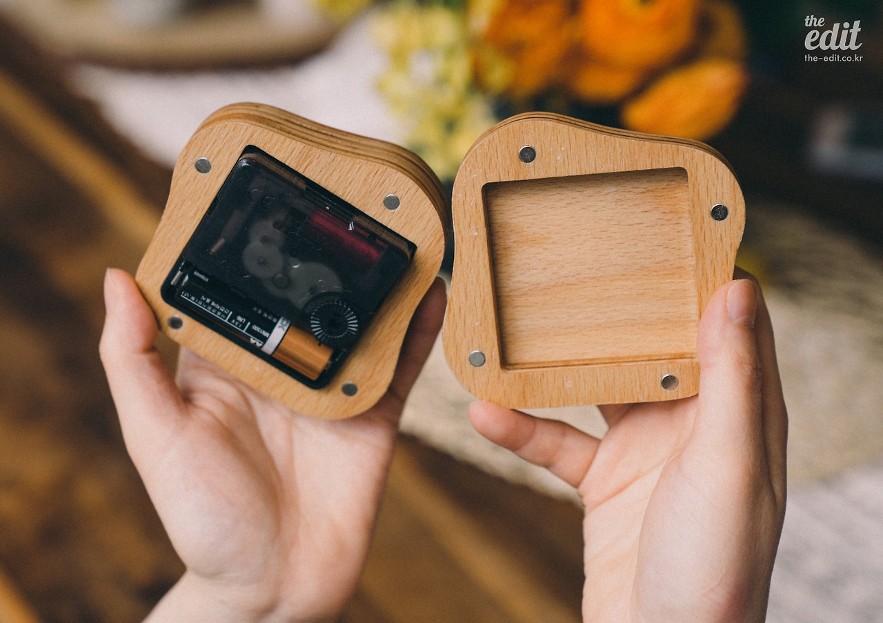 아무리 봐도 배터리를 넣는 곳이 보이지 않아 이리저리 만지고 있는데, 에디터 기은이 솜씨 좋게 열어준다. 시계의 뒤판 전체가 자석으로 고정되는 형식이었다. 보기 싫은 시계의 본체는 나무 안에 쏙 숨어있다. 정말 사소한 것 하나도 신경을 많이 썼구나. 우리 모두 잠시 감탄한다.