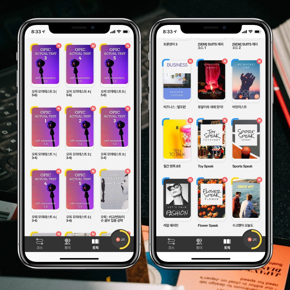 무려 400여 종이 넘는 토픽카드가 일종의 교재가 되는 셈인데, 튜터와 함께 같은 토픽 카드 화면을 보면서 이야기를 하는 거라고 이해하면 된다. 토픽카드는 오픽(OPIC) 마스터처럼 굉장히 실질적인 도움이 되는 것부터, 패션, 스포츠 등 관심 있는 주제, 자신의 직업을 설명하는 카드까지 엄청나게 다양하기 때문에 그날그날 기분이 내키는 주제나 혹은 목적에 맞게 고르면 된다.