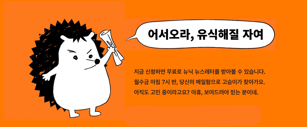 밀레니얼 세대에게 가장 필요하다고 생각되는 뉴스를 큐레이션 해서 보내주는 뉴스레터 서비스. 친구처럼 쉬운 글로, 어려운 뉴스를 어렵지 않게 소개해준다. 마치 디에디트처럼 말이다(!). 뉴스는 모름지기 여러 미디어를 통해 다양한 입장을 들어보고 판단해야 하지만, 바쁜 사람들에게 이런 건 사치다. 단순히 사건을 나열하는 게 아니라 맥락을 설명해주고 사람들이 궁금해하는 포인트를 잘 짚어 주는 내 최애 서비스. 아! 뉴닉의 마스코트, 고슴도치 캐릭터 ‘고슴이’의 매력 또한 상당. 이 서비스 널리 널리 퍼졌으면 한다. 나 여기서 나온 사람 아니다.