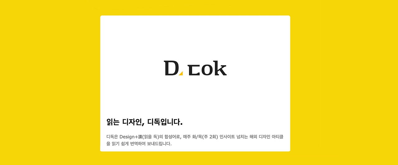 영어를 못해서 해외 트렌드 늦게 접하는 사람들 주목. 디자인 트렌드 기사를 번역해서 보내주는 뉴스레터 서비스 디독을 구독하자. 여기서 번역해주는 기사를 읽다보면 ‘디알못(디자인 알지 못하는 사람)’이라도 디자인을 할 수 있다. 이론뿐만 아니라 당장 써먹을 수 있는 실용적인 기사를 보내주기 때문. 재밌는 기사도 참 잘 골라온다. 예를 들면 ‘5달러짜리 로고와 250달러짜리 로고의 차이점’, ‘요즘 10대가 페이스북 안 쓰고 틱톡 쓰는 이유’, ‘UX 퀴즈! 나의 UX 상식은 몇 점일까?’. 봐요, 벌써 궁금하죠?