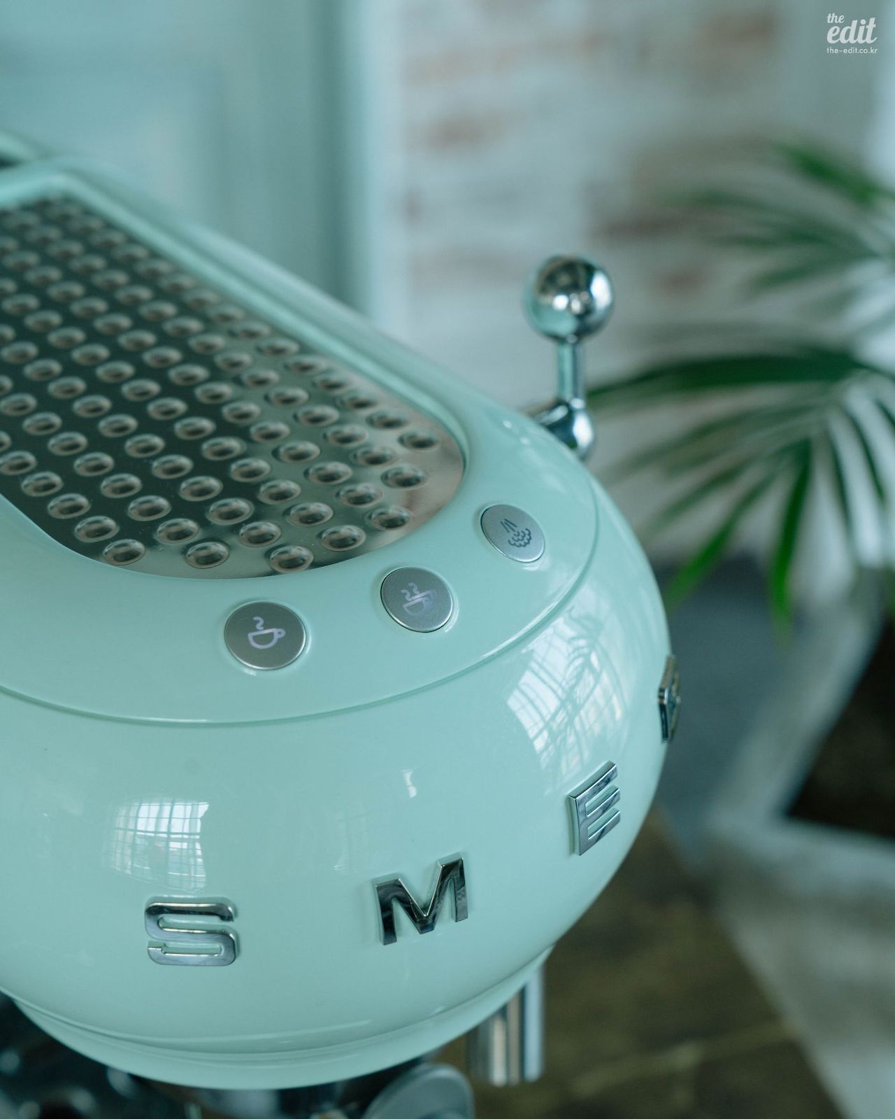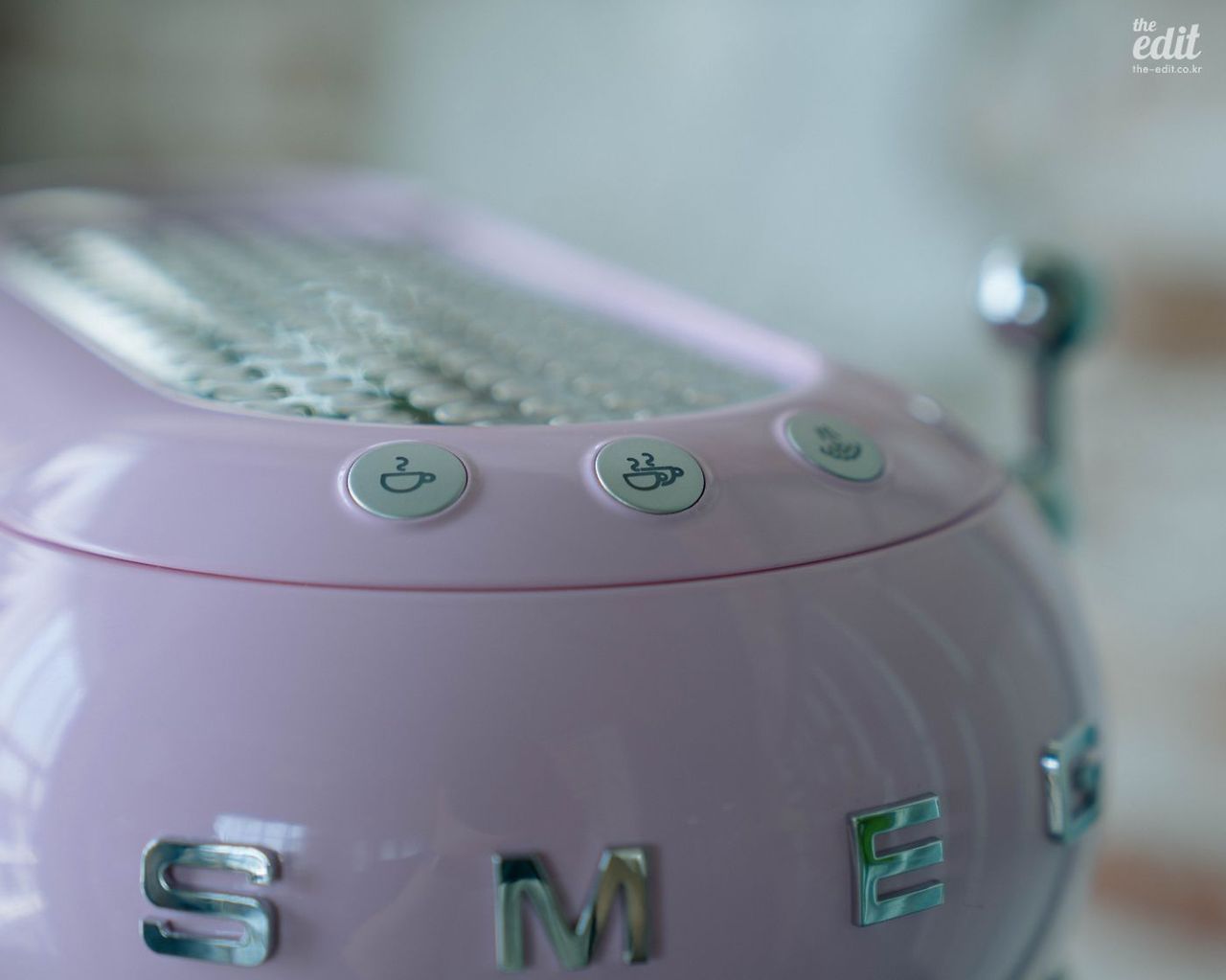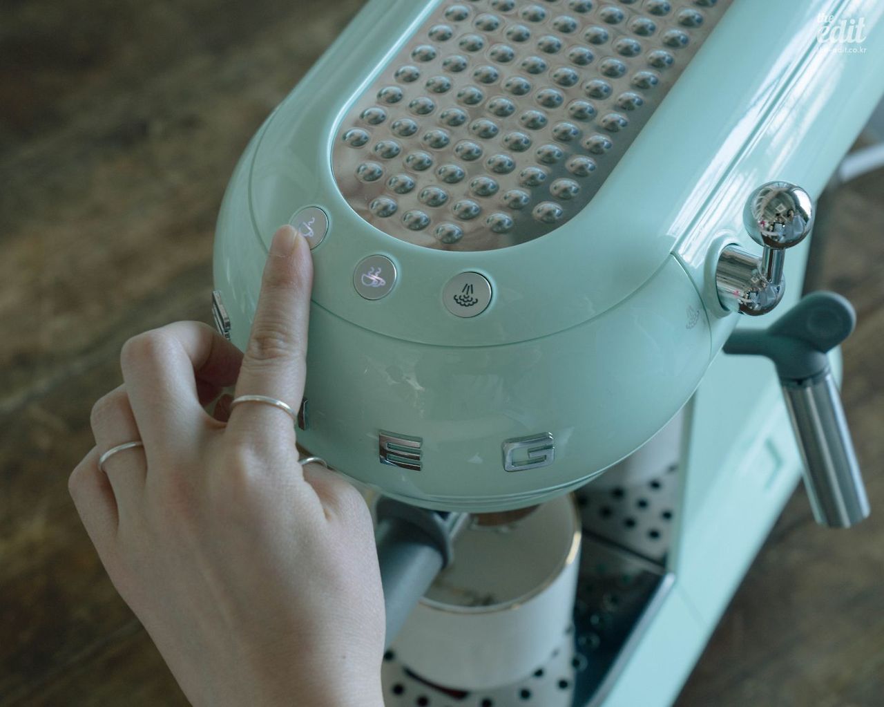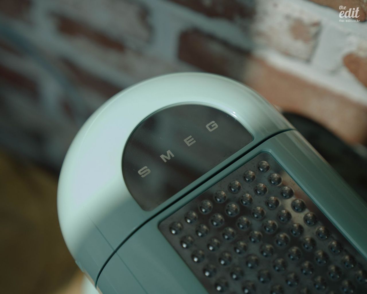 예쁜 기기는 로고조차 아름답다. 정면에 위치한 스메그 로고가 영롱한 나머지 에스프레소를 내릴 때마다 괜히 쓰담쓰담 만져보게 된다. 머신 상단에는 컵 워머 기능이 있는데, 올록볼록한 표면이 부드러워 또 만져보게 된다. 컵은 하나 이상 올라가진 않는데, 집에서 쓰기 편하도록 작은 사이즈로 나왔기 때문이다. 단점이자 장점이 되겠다.