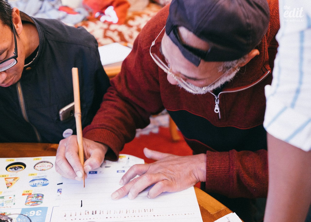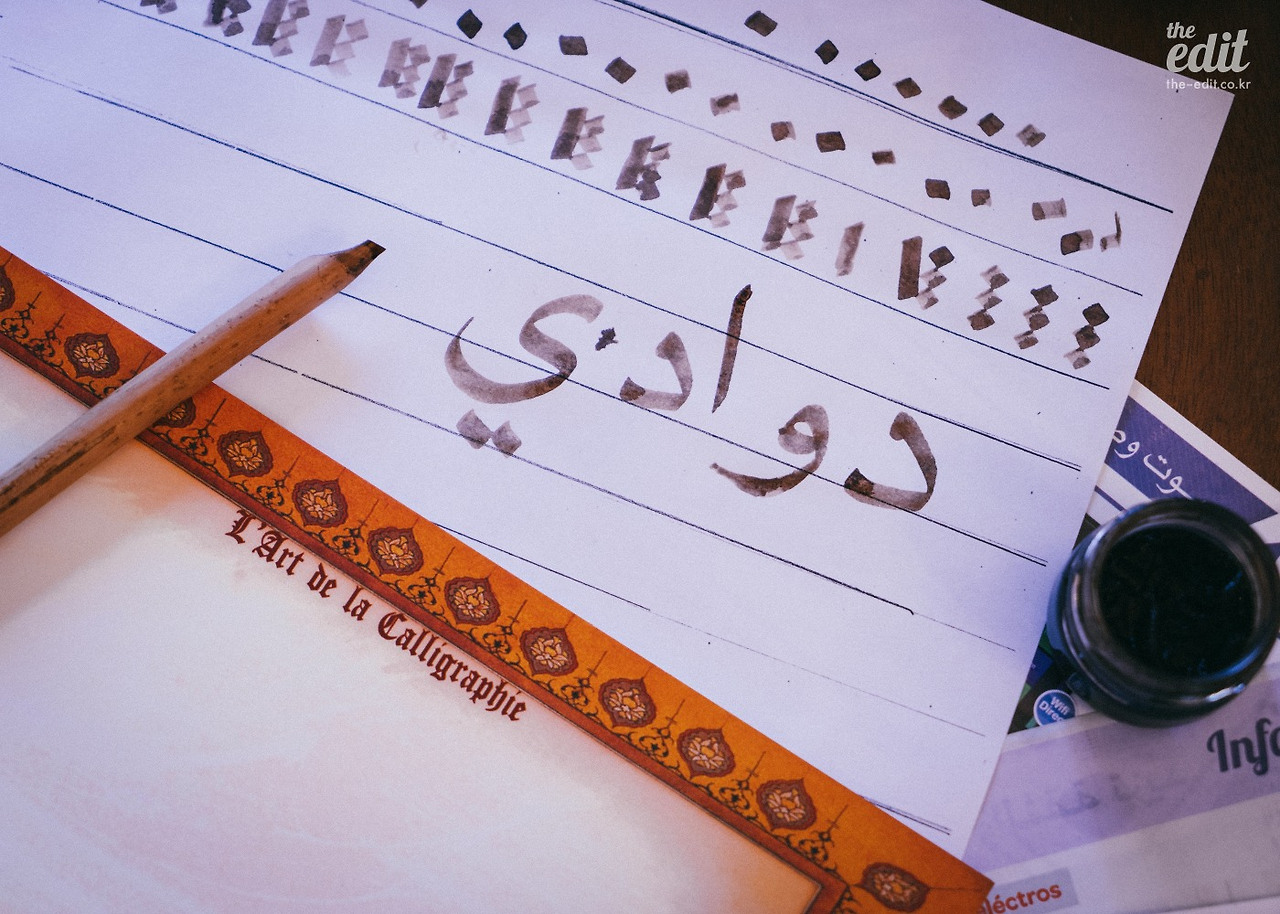 자 이제 다시 본론으로 돌아오자. 우리가 샤이마에 집에 초대된 이유는 캘리그래피를 체험해보기 위해서다. 얇은 대나무 끝을 뽀쪽하게 깎은 펜에 잉크를 묻혀 선을 긋는다. 어떤 글자든 일단은 선과 점을 그리는 게 기본이다. 다들 사뭇 진지하다.
