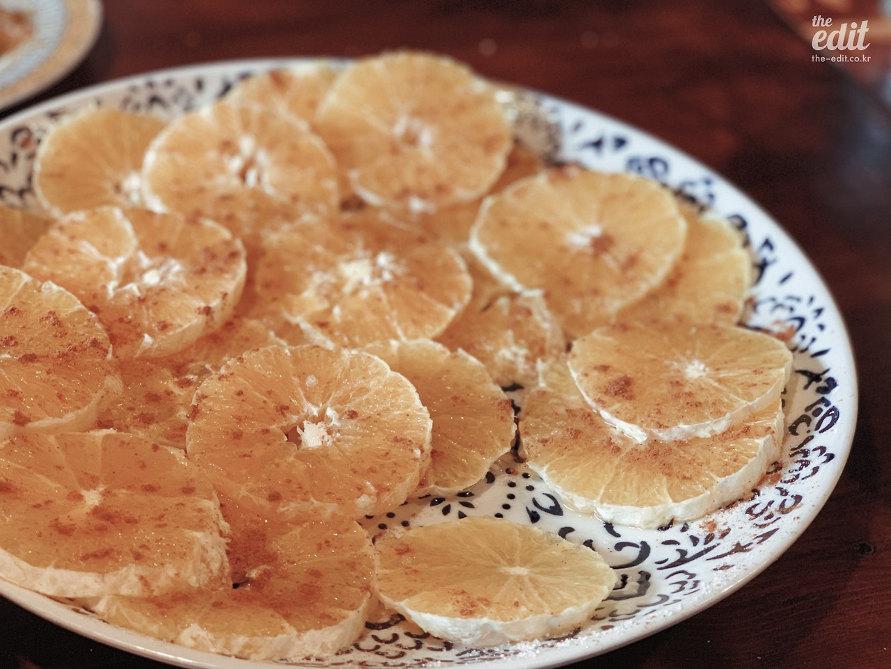 오렌지를 먹는 모로코 사람들만의 독특한 방법이 있는데, 바로 슬라이스한 오렌지에 설탕과 시나몬 가루를 뿌려먹는 거다. 나쁠 것도 없는 맛이지만 이게 뭐가 이렇게 특별한가 싶은데, 나중엔 식후마다 오렌지를 찾는 내 모습을 발견했다.