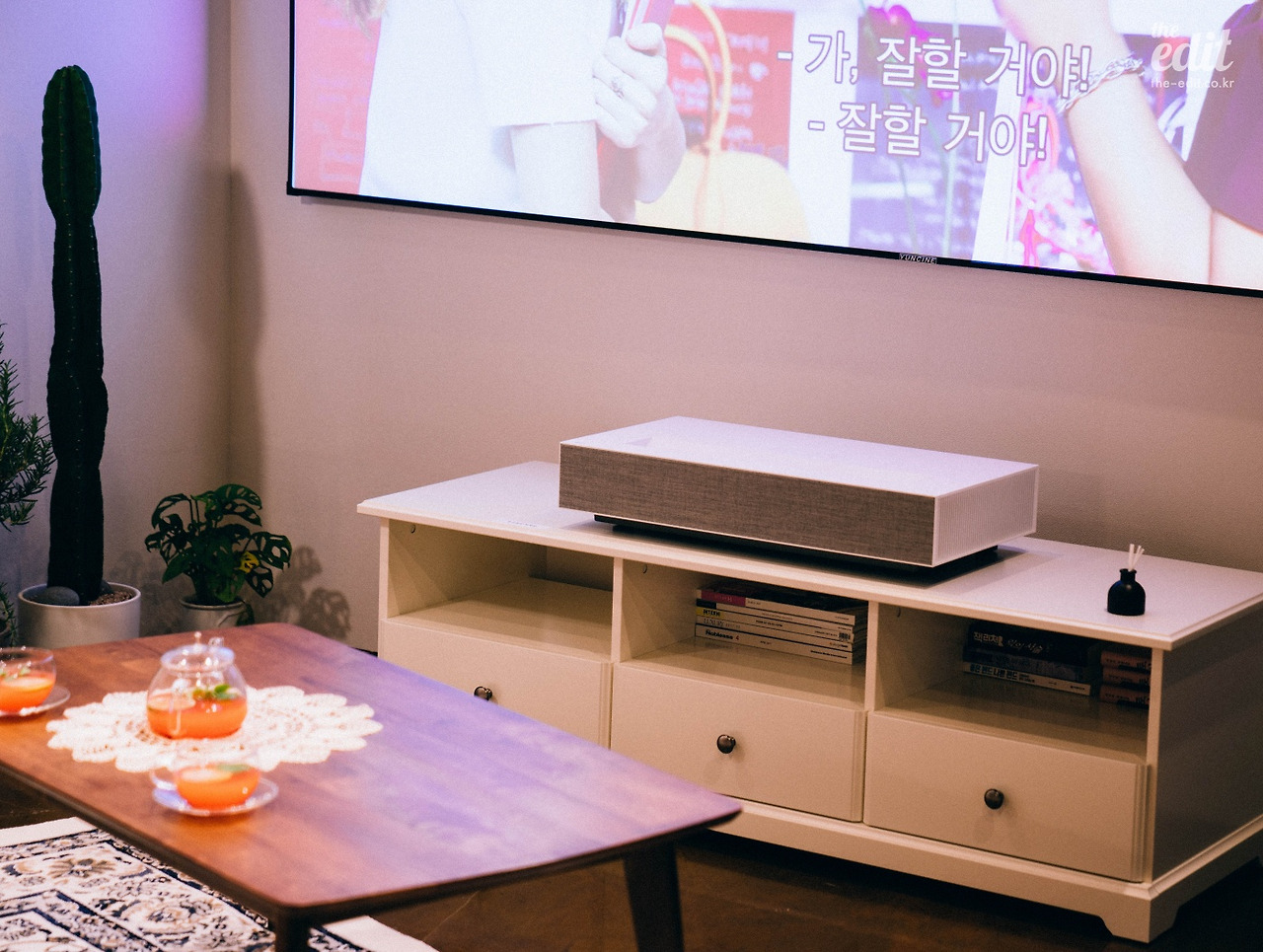 특히 마음에 들었던 건 시네빔의 디자인. 빔프로젝터를 한번쯤 샀거나 구매를 고민했던 사람들은 잘 알겠지만 프로젝터의 디자인은 대체로 투박한 편이다. 어쩌면 프로젝터에 디자인이란 그리 중요한 요소가 아니었을 수도 있다. TV나 냉장고는 공간을 분위기를 좌우하는 가전으로 여겨지지만, 빔프로젝터는 필요할 때 꺼내서 쓰는 정도니까. 그런 점에서 보면 시네빔 Laser 4K는 차라리 인테리어 소품에 가깝다. 쓰지 않을 땐 숨기고, 필요할 때 꺼내는 게 아니라 공간의 분위기를 살려준다.
