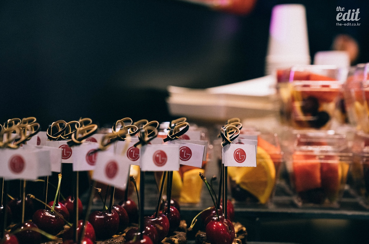 도슨트의 가이드가 끝나자 LG 임원진의 축사, 신제품 관련 질의응답 그리고 셀럽(?)의 축사가 있을 거라는 안내를 받았다. 나는 LG 깃발이 꽂힌 체리를 먹으며 ‘셀럽의 축사란 과연 무엇일까’ ‘어떤 셀럽이길래 축사를 할까‘ ‘직업이 셀럽인 걸까’ 궁금해하며 앉아있었는데, 알고 보니 가수 헨리였다.