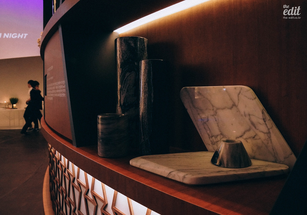 두 번째 제품 역시 렉서스의 스팬들 그릴을 모티브로 디자인했다. 석공예가 김현주의 대리석 트레이다. 마름모꼴의 형태로 측면을 깎아내는 작업을 통해서 렉서스의 디자인 철학을 모토가 되는 고급스러움과 정교함을 담고자 했다고 소개하더라.