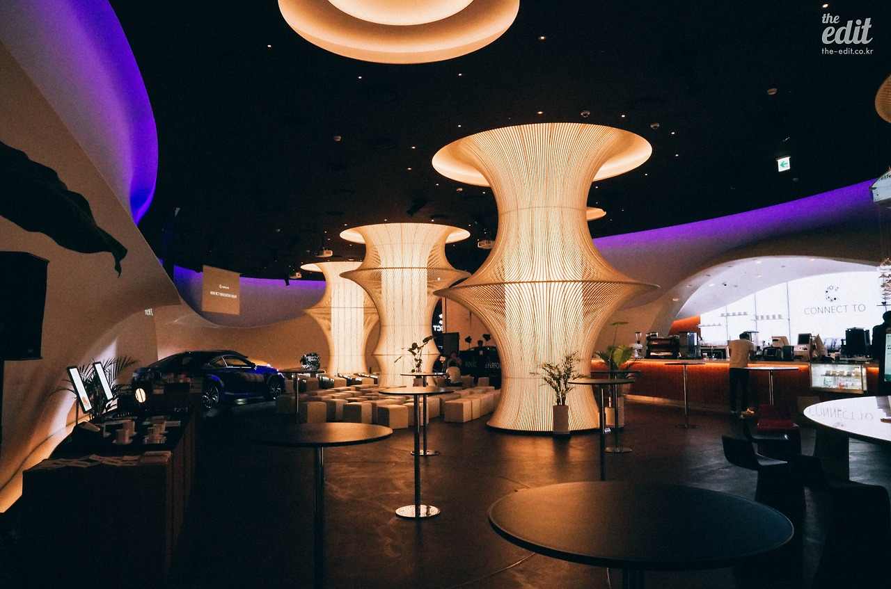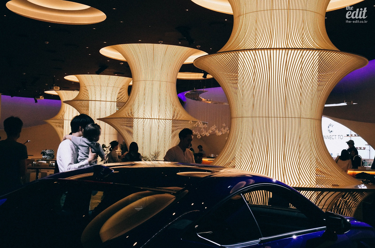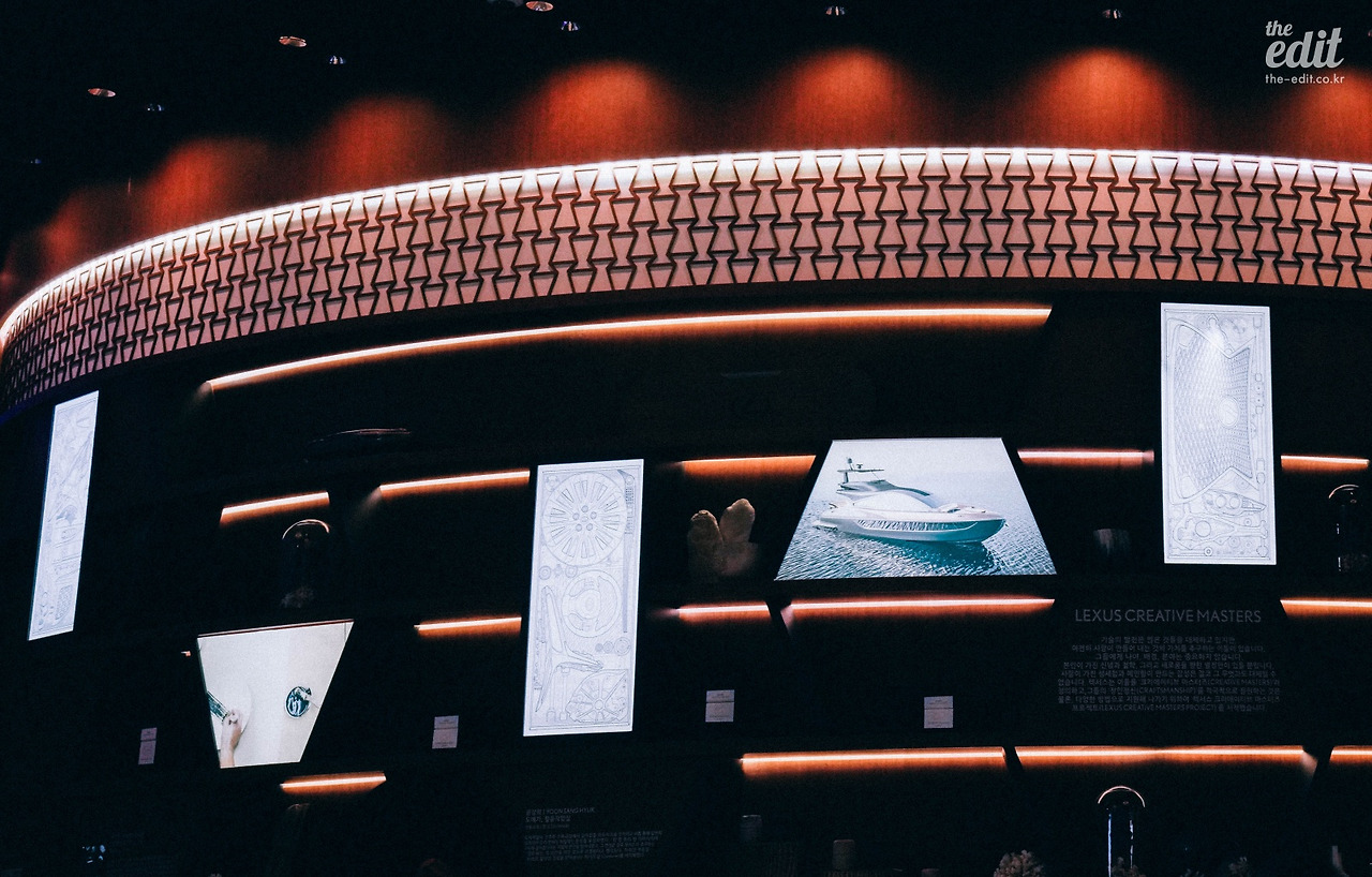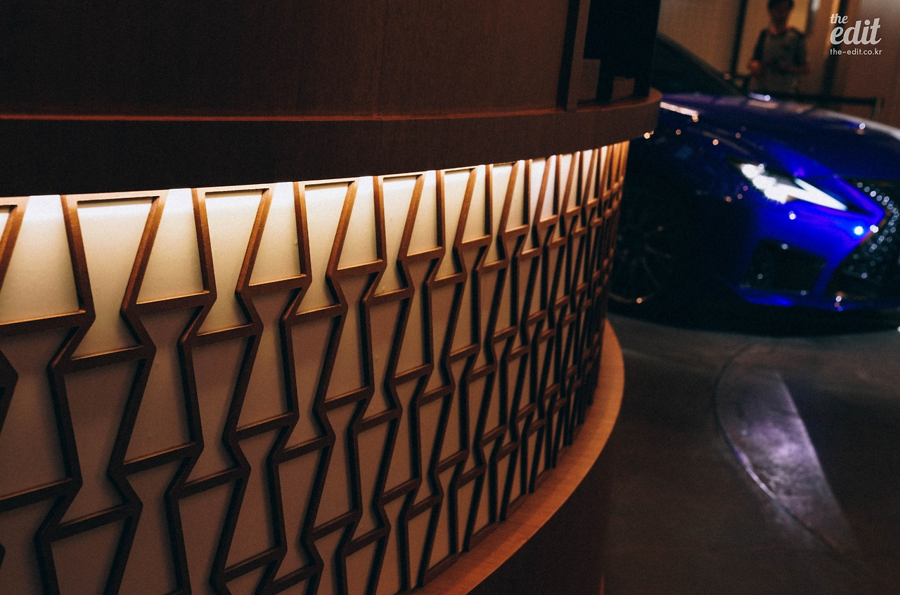 공간에 사용된 렉서스의 디자인은 스핀들 그릴만이 아니다. 공간 중심에서 멀어져 전체를 조망하니 곡선으로 조형물이 물 흐르듯 벽에서 벽으로 이어져있었다. 마치 거대한 렉서스 안에 들어와 있다는 착각이 들 정도였다.