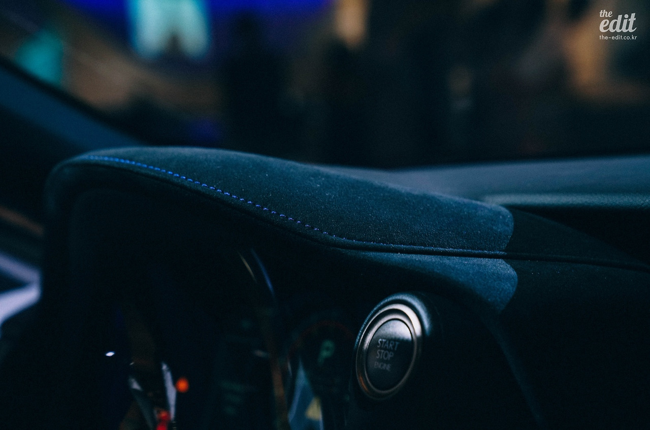 유려한 외관과 달리 내부는 아늑했다. 아날로그 시계, 부드러운 알칸타라 소재의 대시보드 그리고 드라이버의 손이 닿는 핸들과 레버에는 파란 실, 흰 실로 박음질되어있는 가죽이 감싸고 있었다.