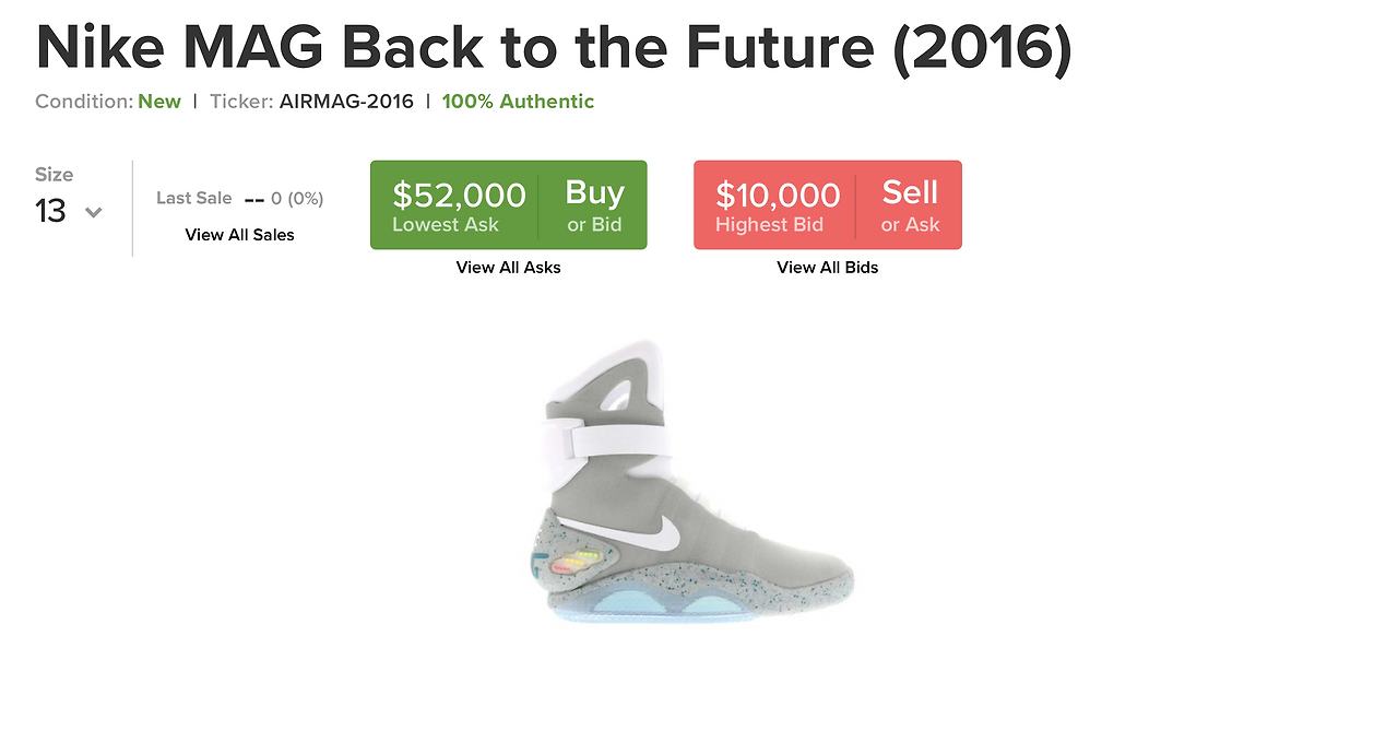 우선 가장 눈에 띄는 가격부터 이야기를 해보자. 가장 극단적인 사례가 나이키 맥(Nike Mag), 흔히 맥플라이(Mcfly)라고 불리는 물건이다. <백 투 더 퓨쳐2>에 나왔던 나이키 제품을 실제로 만들어낸 신발인데, 아쉽게도 실제로 영화에 나왔던 모든 기능이 구현된 건 아니다.