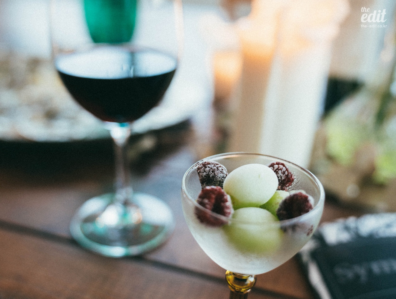 얼린 청포도와 산딸기가 나왔다. 기본으로 제공되는 안주는 아니고 가끔 준비될 때만 서비스로 주는데 내가 운이 좋았다. 청포도를 얼려먹은 건 처음이었는데, 한 입 베어 먹으니 입안에 청포도향이 사르르 퍼졌다. 청포도맛 슬러시를 먹는 것처럼 시원했다.