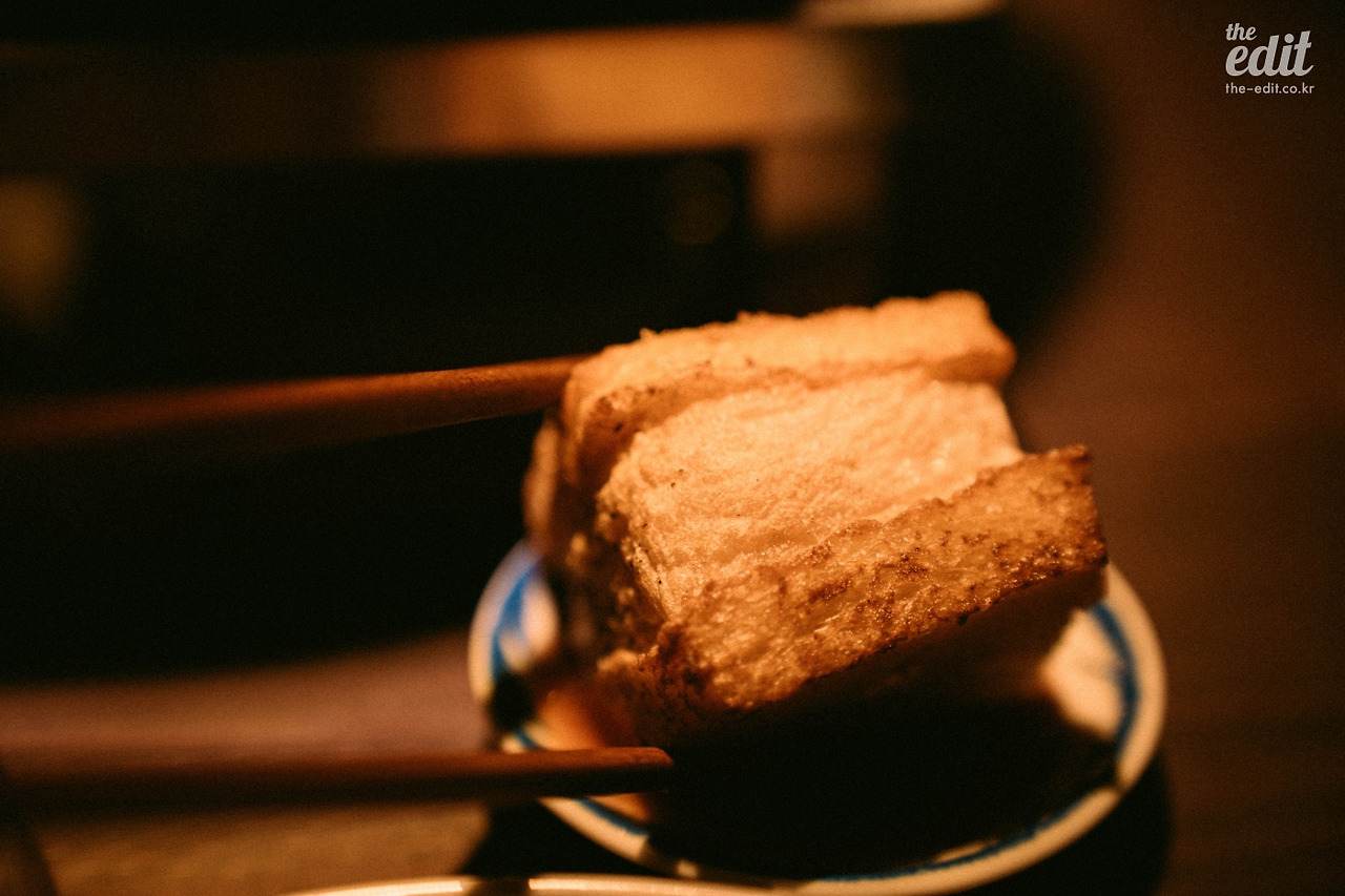 기본 안주로는 일본에서 많이 먹는 구운 풋콩(에다마메)이 제공되는데, 이것 또한 고소해서 계속 손이 가더라. 그 위에 올라간 건 그라나파다노 치즈다. 함께 먹으면 별미. 예전에 함께 갔던 친구는 주문한 안주가 나왔는데도 계속 콩을 까먹었었다.