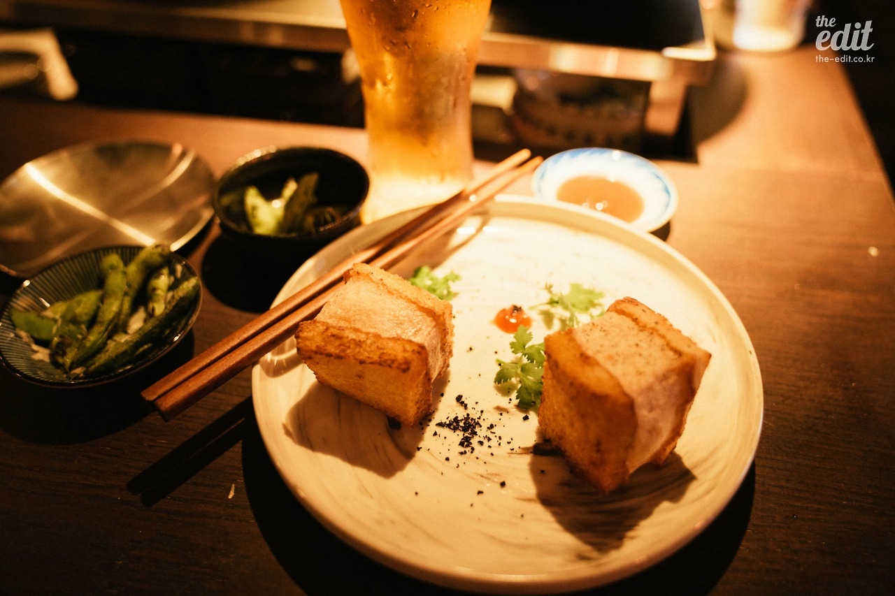 나는 멘보샤(7,000원)와 생맥주를 한 잔 시켰다. 멘보샤는 하루 여덟 세트만 파는 한정 메뉴니 가능하다면 꼭 먹어보면 좋겠다. 빵 사이에 있는 새우살의 두께가 아주 실하고, 느끼한 맛도 없다. 토마토 케첩을 베이스로 매콤한 맛을 내는 소스에 찍어 먹으면 하루의 노곤함이 풀릴 거다. 이 분위기에서는 당연히 맥주도 빠질 수 없지. 생맥주는 맥스가 제공된다.