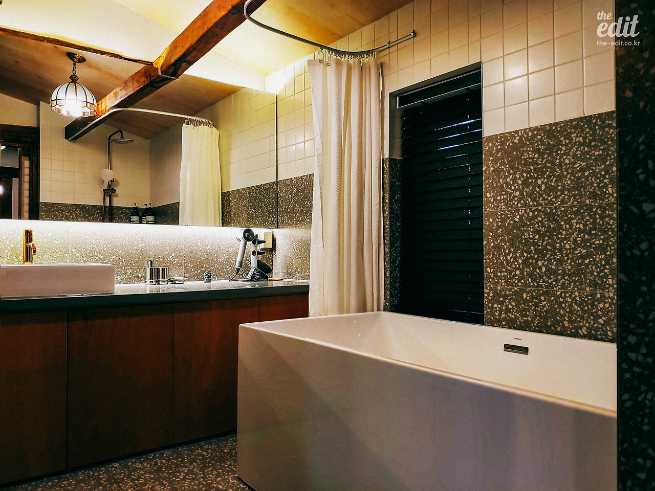 욕실은 욕조가 있고 세련된 간접 조명으로 이뤄져 있다. 오른쪽에 보이는 문을 열면 수영장으로 나갈 수 있다.