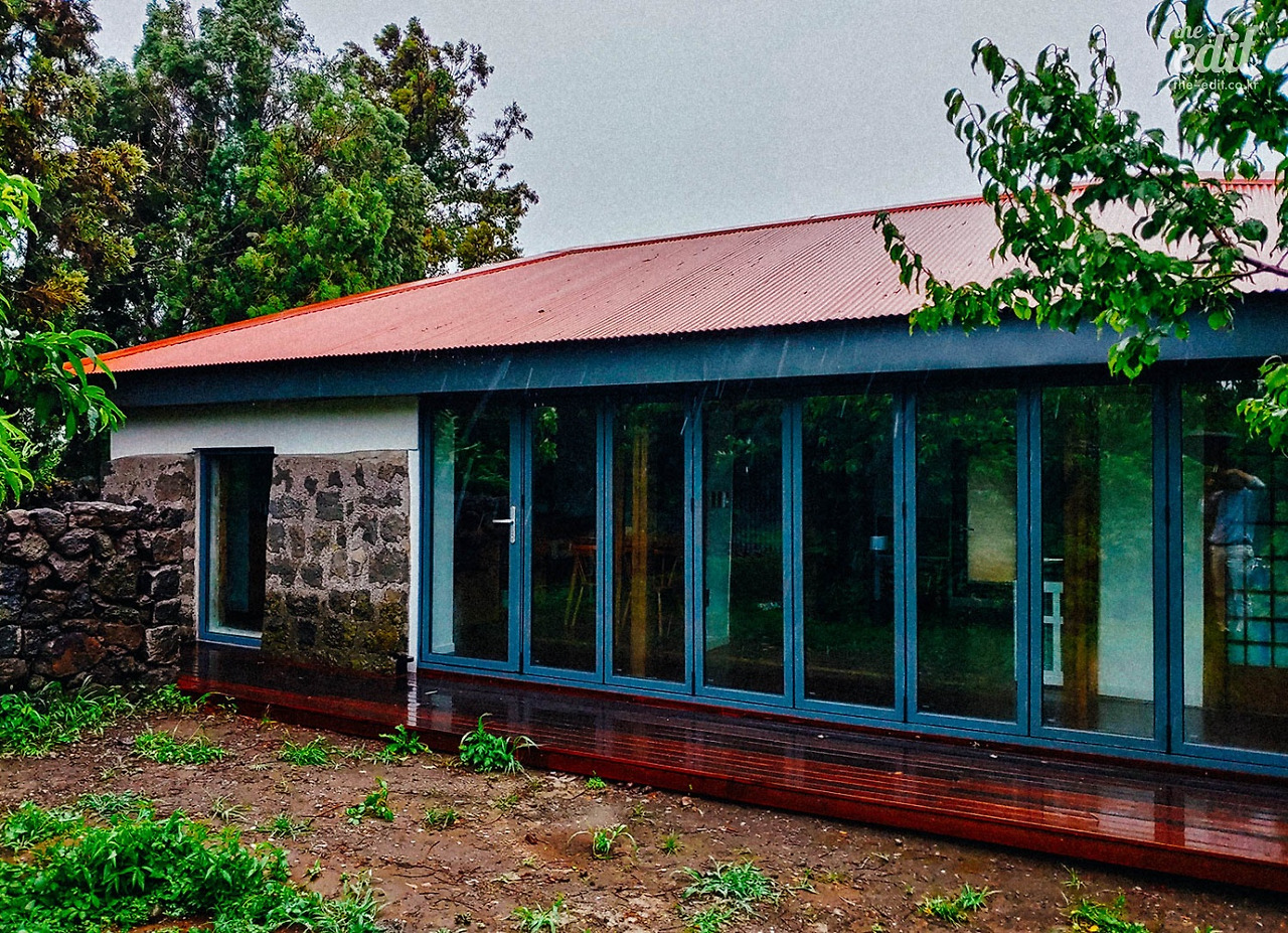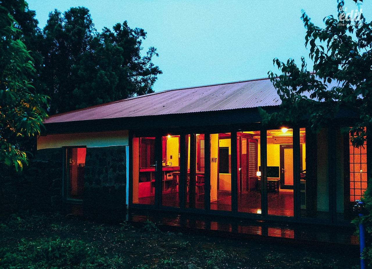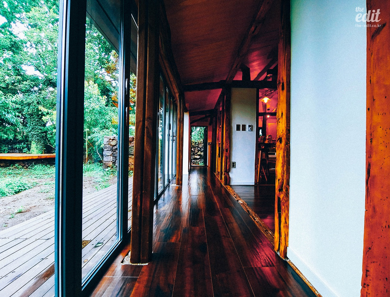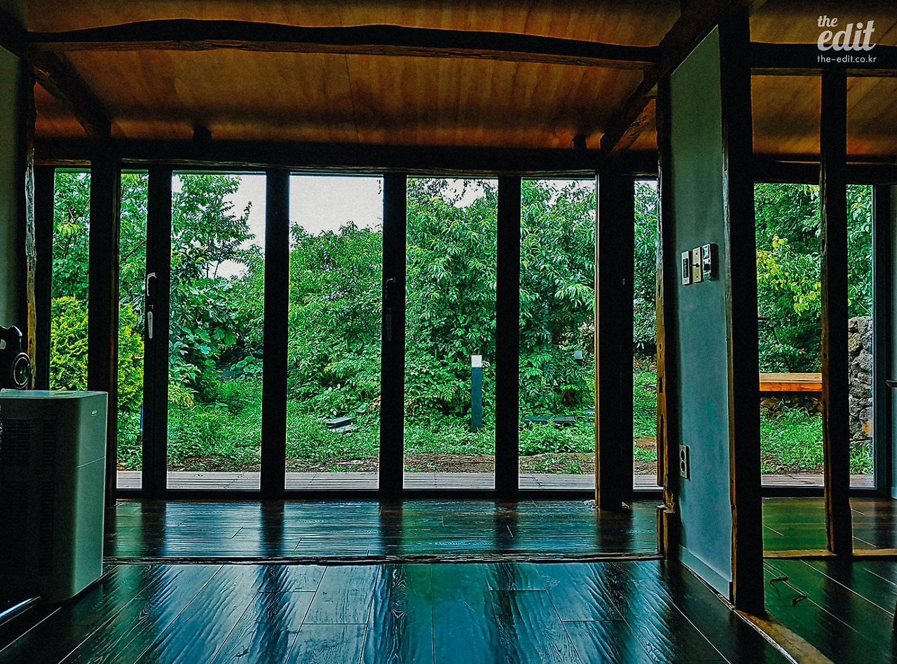 전면에는 복도가 있고 복도 앞에 큰 폴딩도어가 있다. 여기에 앉아 비 오는 숲을 한참 바라봤다. 비가 좀 잦아지기에 폴딩도어를 다 열어봤다.