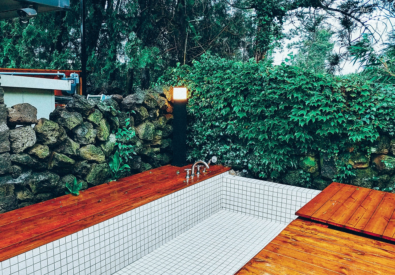 데크 중에 덮개를 열어보니 작은 수영장이 있다. 사실 대형 욕조에 가깝기는 하지만 아이들이 있다면 물놀이도 가능하고 여러 명이 들어가도 비좁지 않다. 주변은 나무와 돌담으로 둘러싸여 원초적인 모습으로 돌아다녀도 안전하다. 게다가 추가 비용 이런 것도 없다. 그냥 이용하고 싶은 만큼 이용하면 되는 프라이빗 풀이다.